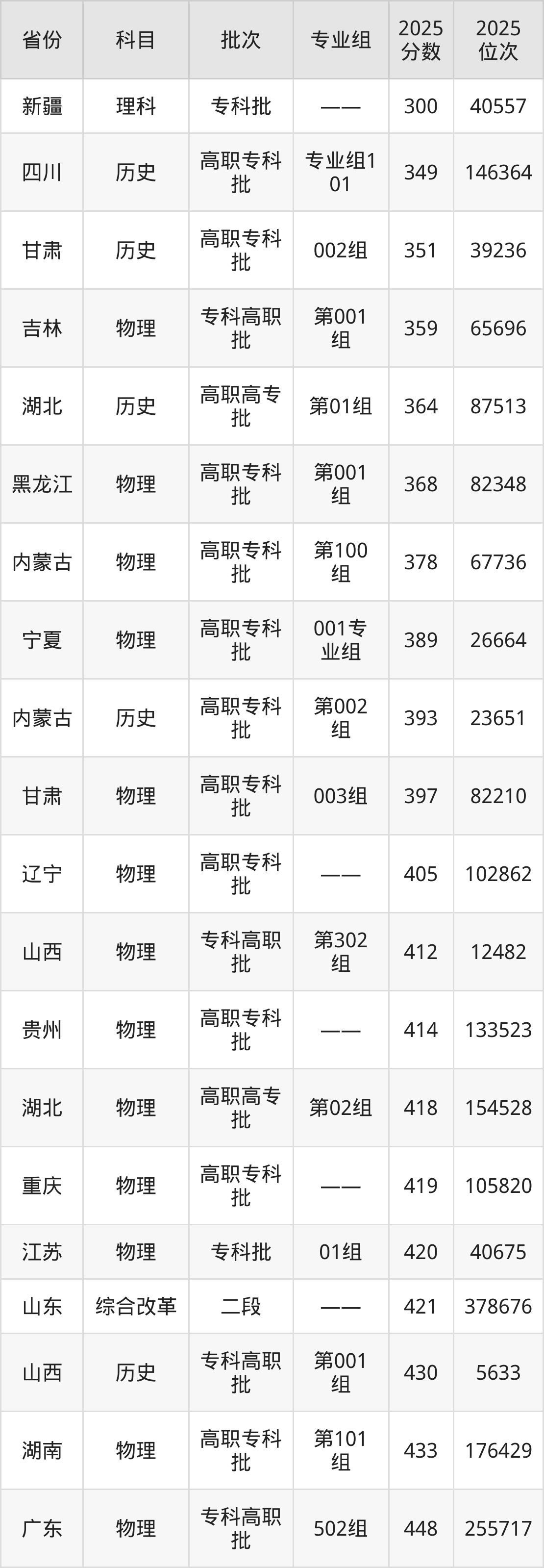 最低录取分数线是300分,对应位次是40557名,招生地区为新疆;