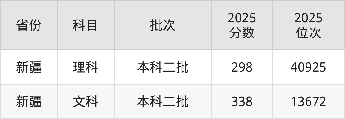 最低录取分数线是298分,对应位次是40925名,招生地区为新疆。