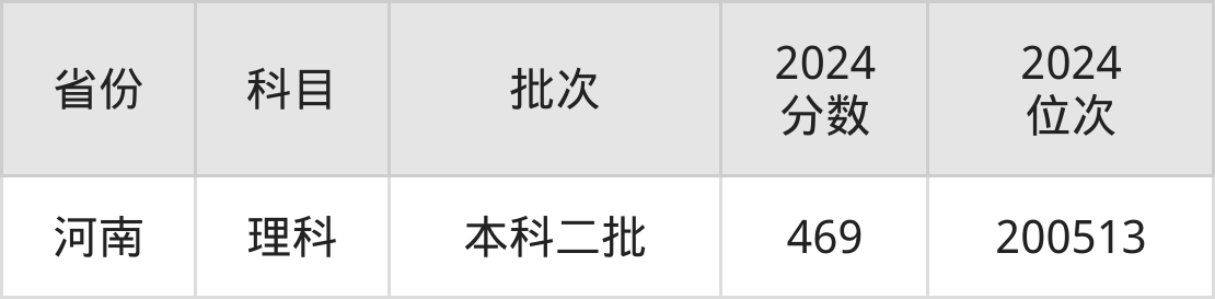 最低录取分数线是469分,对应位次是200513名,招生地区为河南。