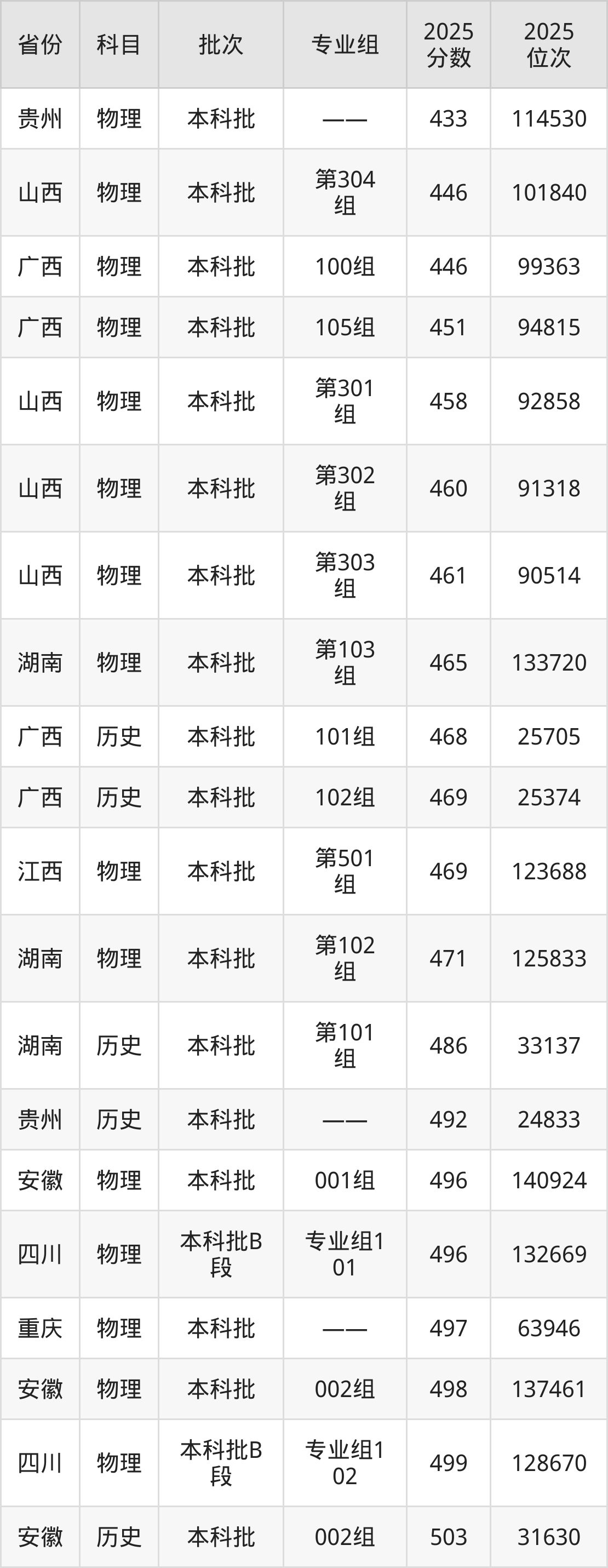 最低录取分数线是433分,对应位次是114530名,招生地区为贵州;