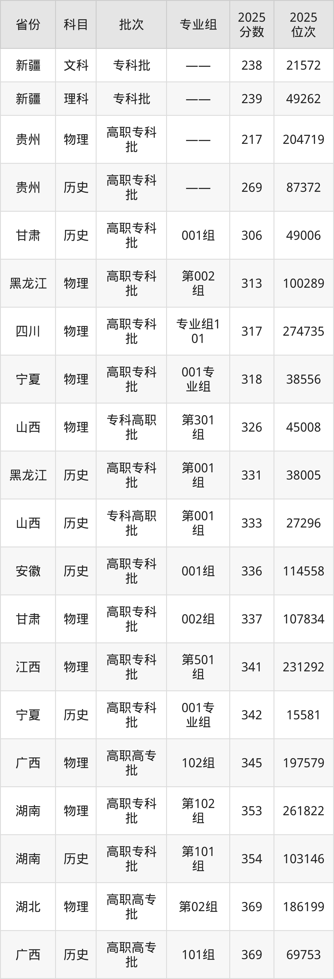2025年荆门职业学院在各省普通批录取分数线一览表: