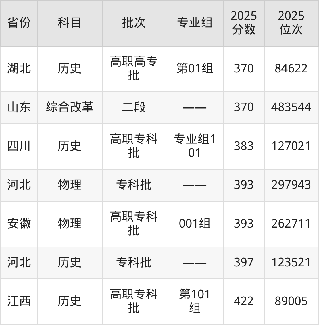 2025年荆门职业学院在各省3+3综合改革的录取分数线为370分。