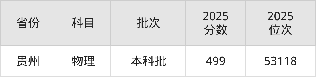 最低录取分数线是499分,对应位次是53118名,招生地区为贵州。