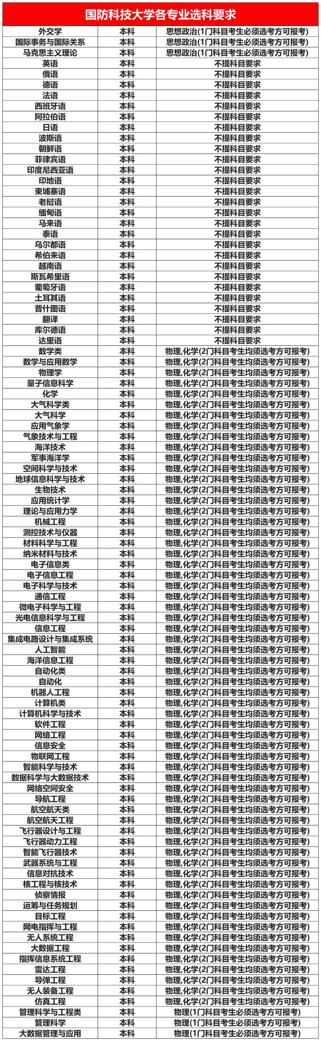 在军校专业中,“物理+化学”的可选科目范围是最广的,小编在此以国防科技大学2024年的专业选科要求为例,如下: