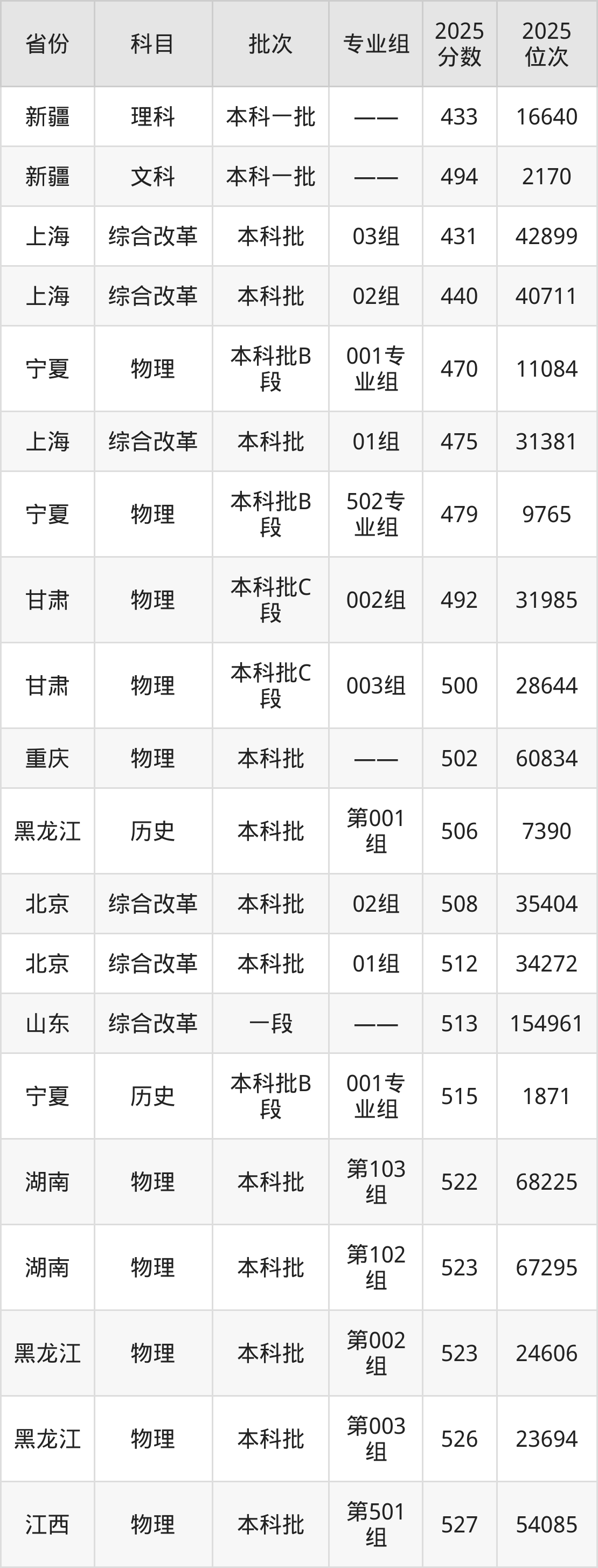 最低录取分数线是433分,对应位次是16640名,招生地区为新疆;