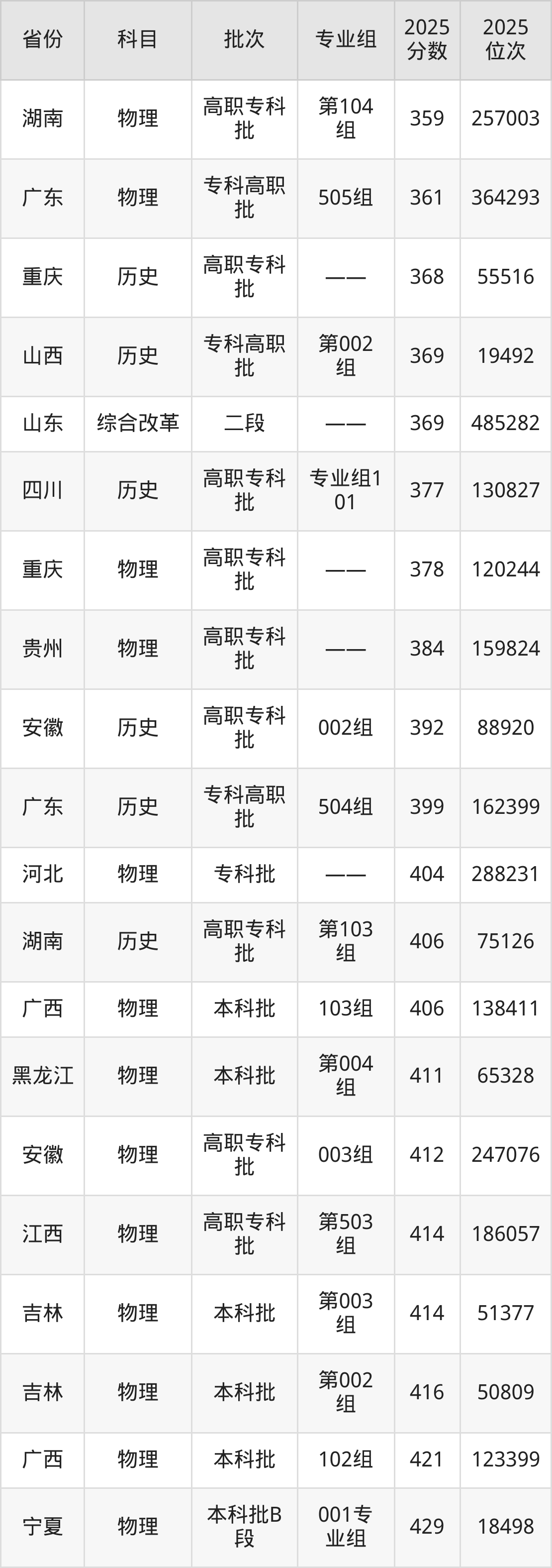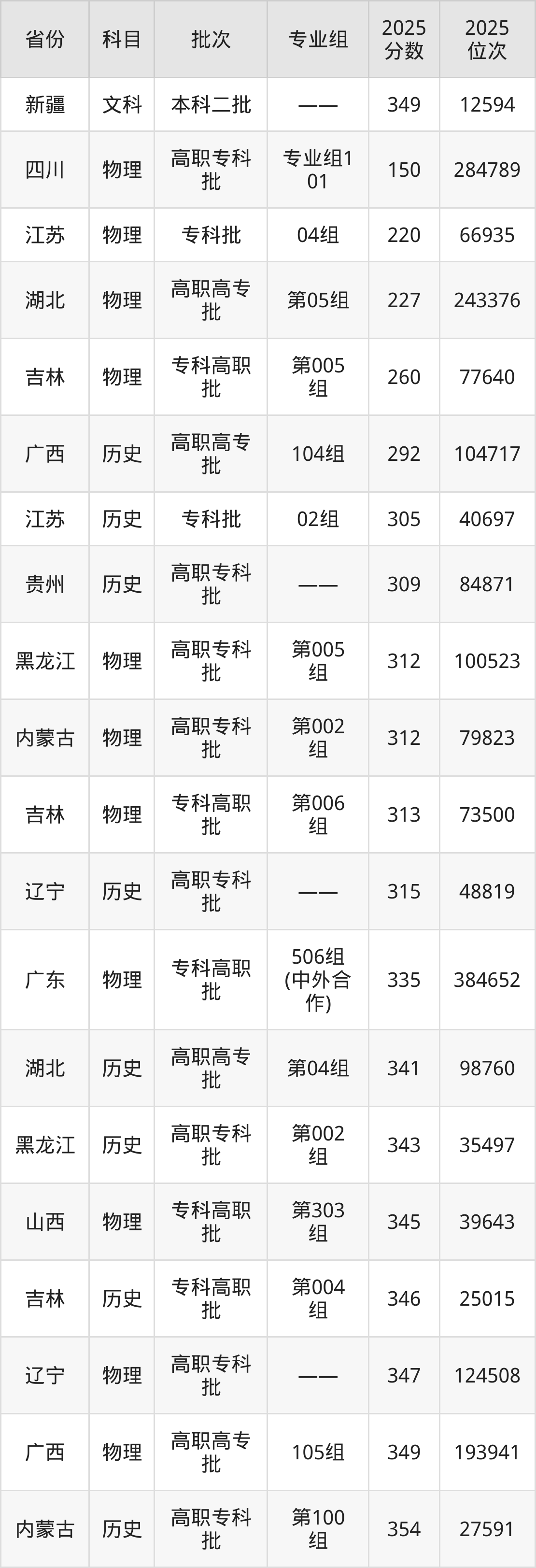 最低录取分数线是150分,对应位次是284789名,招生地区为四川;