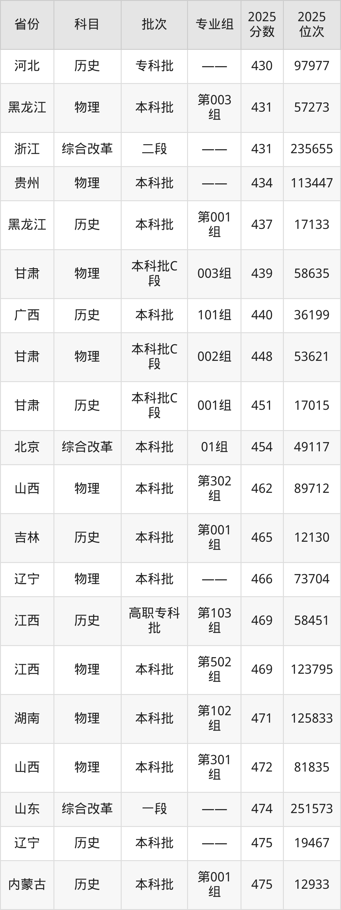 2025年河北科技工程职业技术大学在各省普通批录取分数线一览表: