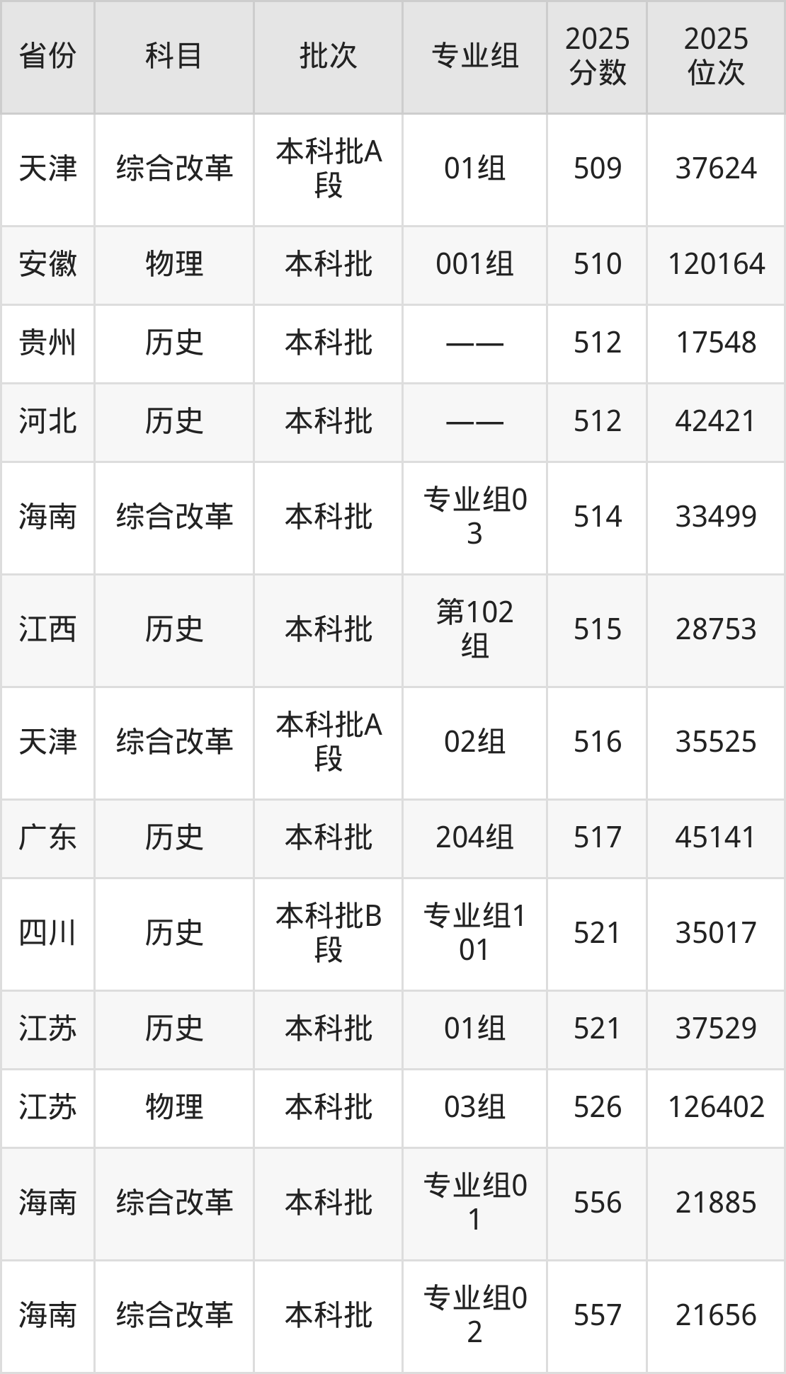 最高录取分数线是557分,对应位次是21656名,招生地区为海南。