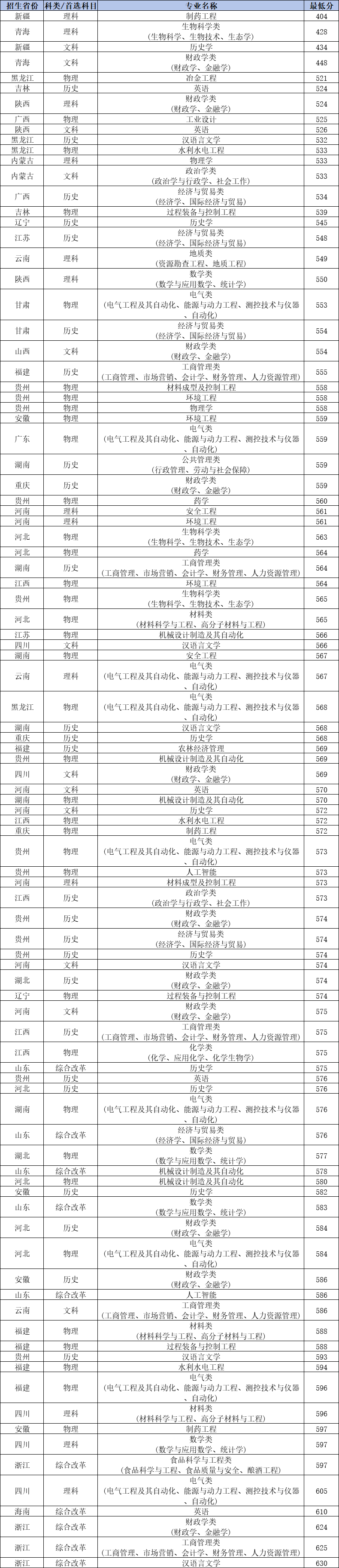 以2024年高考招录数据为例,贵州大学高校专项计划在全国各省招生分数范围位于404分~630分之间。其中贵州考生物理类最低需558分(材料成型及控制工程),历史类最低需574分(财政学类(财政学、金融学));黑龙江考生物理类最低需521分(冶金工程),历史类最低需532分(汉语言文学)等。