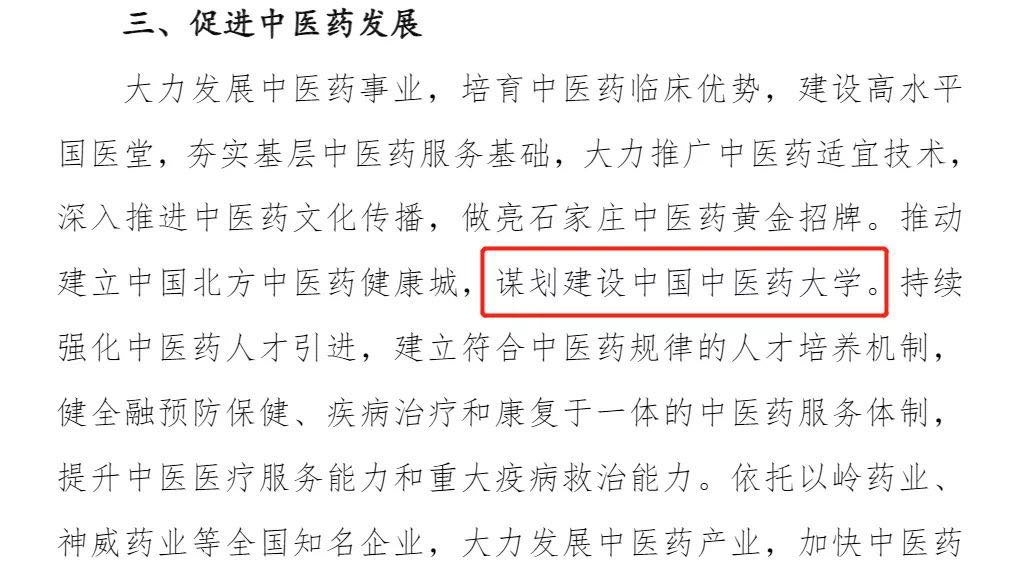 根据目前得到的信息,河北省石家庄市正式发布了《国民经济和社会发展第十四个五年规划和二〇三五年远景目标纲要》。其中明确确定了,石家庄市将在“十四五”期间谋划建设中国中医药大学。