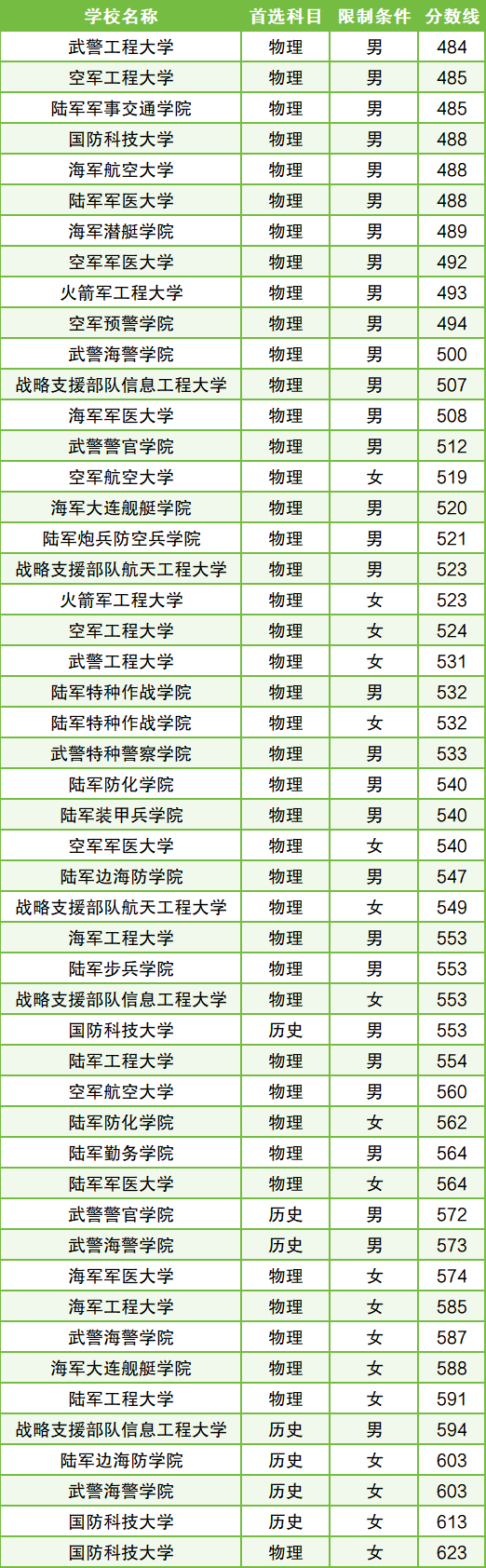 武警工程大学(物理类484分)、空军工程大学(物理类485分)、陆军军事交通学院(物理类485分)、国防科技大学(物理类488分)、海军航空大学(物理类488分)、陆军军医大学(物理类488分)。