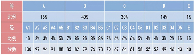 北京市等级性考试结束后,会按照考生原始成绩划分为A(15%)、B(40%)、C(30%)、D(14%)、E(1%)等5个级别,这5个等级可以细分为21个级别,每个级别之间的分差为3分,最低赋分为40分,最高为100分。以下为北京高考赋分制21个等级表详情: