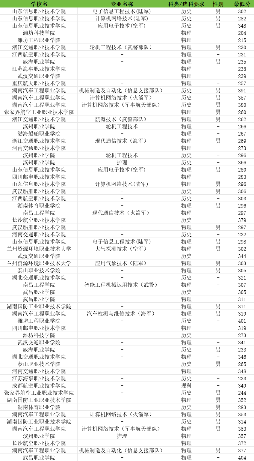 而士官学校在广西历史类的最低录取分数线则是302分,不过仅限男生报考,因此广西历史类男生最低302分可以上士官学校。