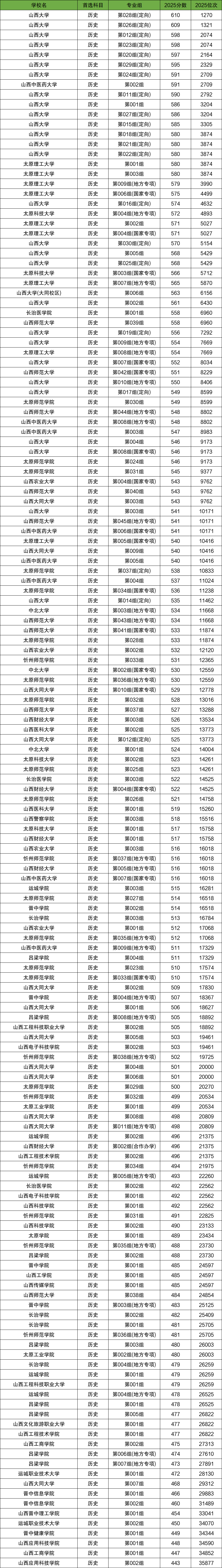 下文为2025年山西省本科大学在山西历史类录取分数线和位次排名表,供大家参考: