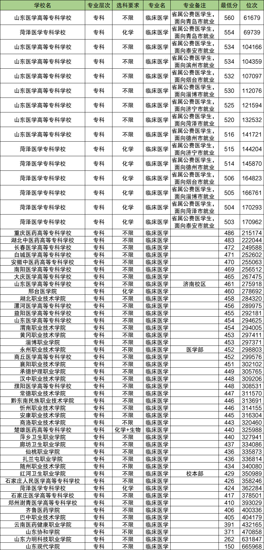 分数比较低的专科临床医学大学有山东现代学院(最低150分)、山东力明科技职业学院(最低262分)。