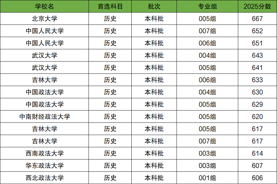 其中最低分院校为西北政法大学,2025年最低分为606分。最高分院校为北京大学,2025年最高分为667分。