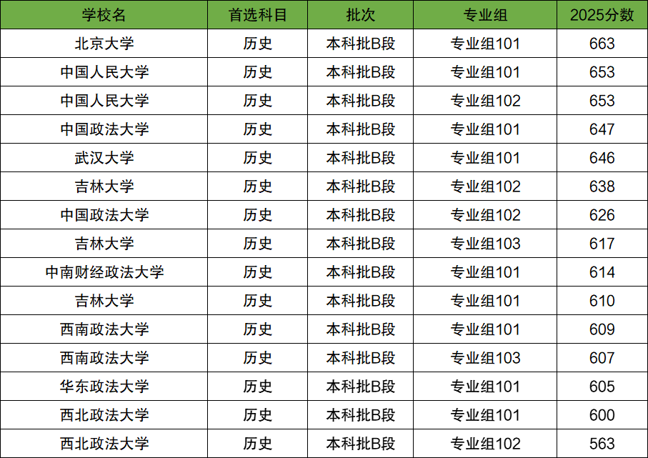 其中最低分院校为西北政法大学,2025年最低分为563分。最高分院校为北京大学,2025年最高分为663分。