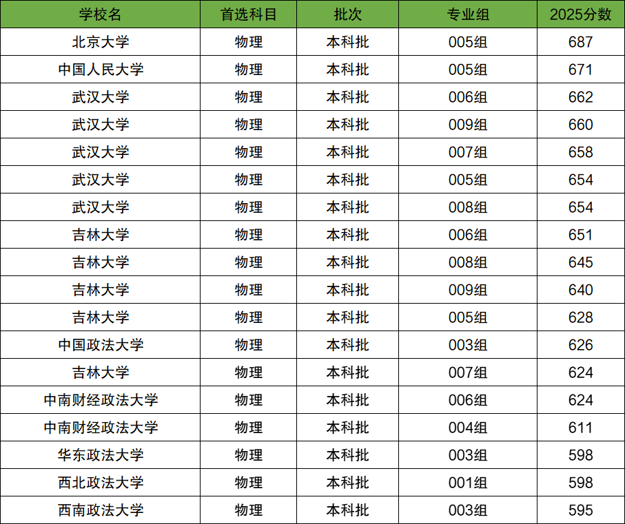 其中最低分院校为华东政法大学,2025年最低分为586分。最高分院校为北京大学,2025年最高分为690分。