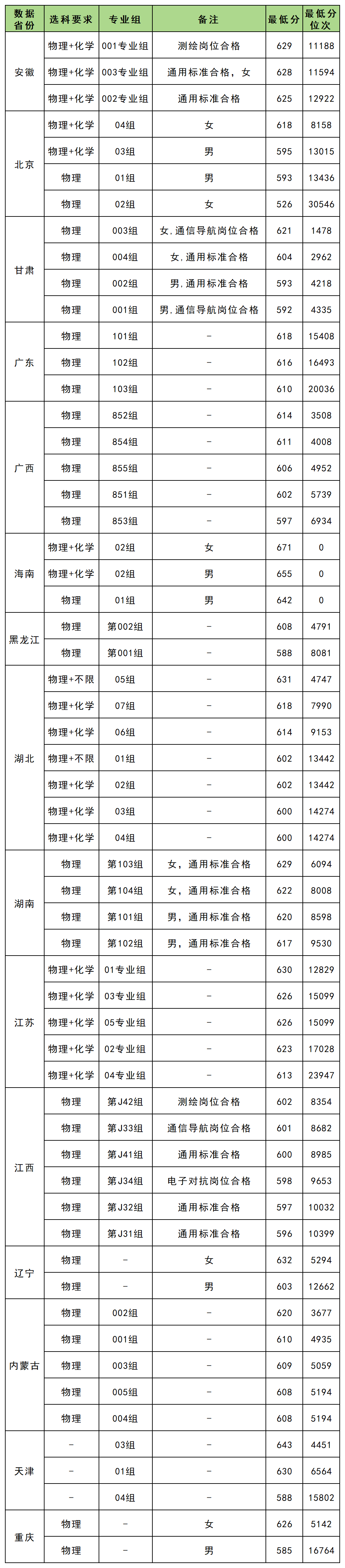 001专业组:物理+化学,测绘岗位合格,最低分629分;