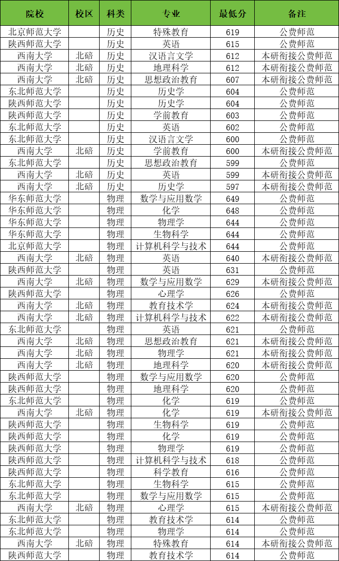 最低分的公费师范生院校及专业是东北师范大学的教育技术学与物理学专业、西南大学的特殊教育专业、陕西师范大学的教育技术学专业,录取分数线为614分。