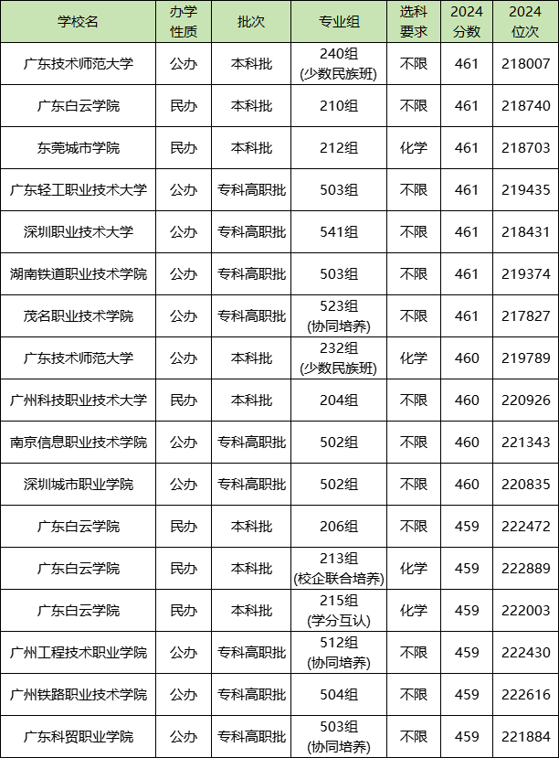 广东物化政460分的考生既能上本科大学也能上专科大学,其中属于公办的有广东技术师范大学240组少数民族班(461分)、深圳职业技术大学541组(461分)、南京信息职业技术学院502组(460分)等。具体名单如下表所示: