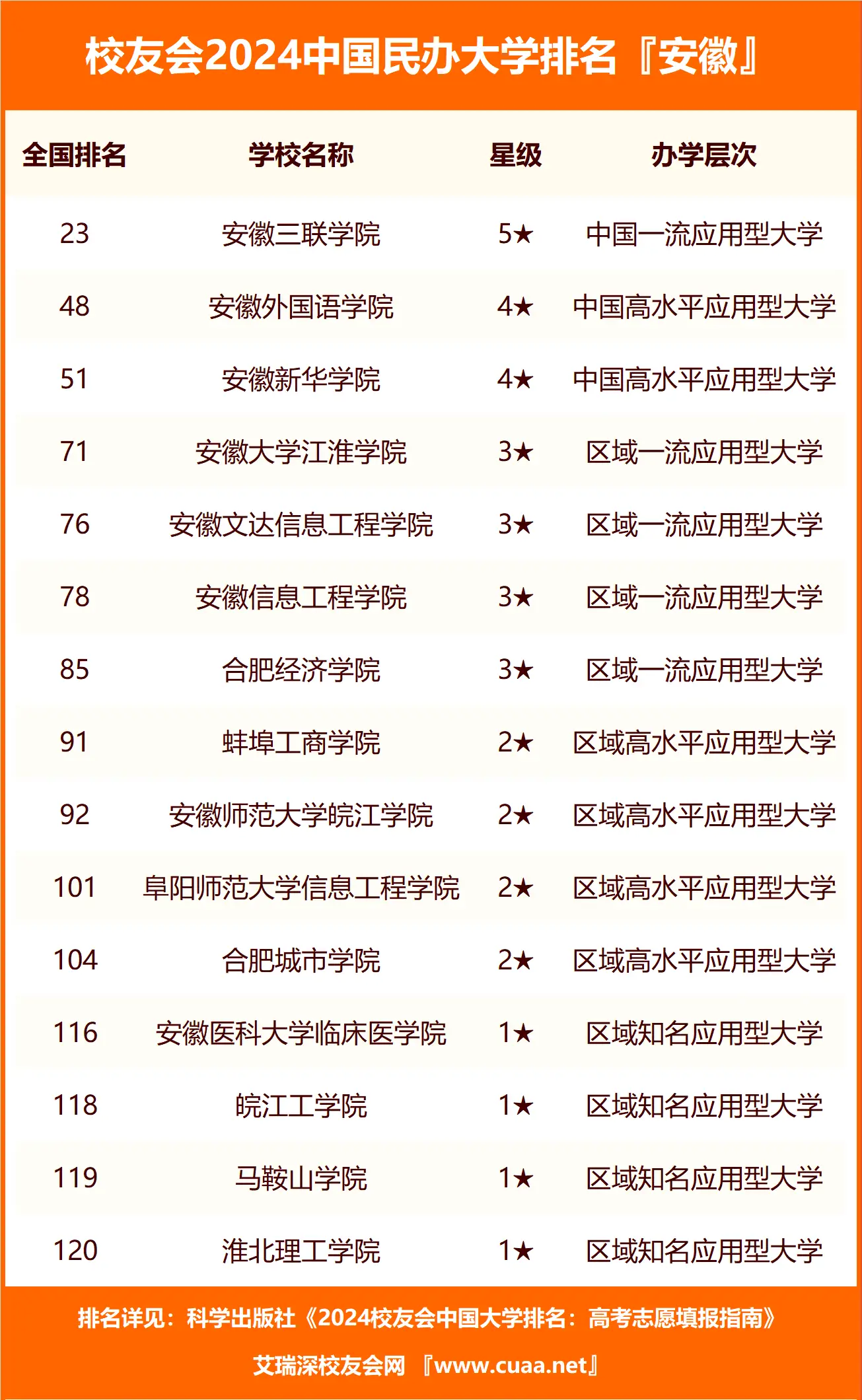 根据校友会2024年安徽的民办本科大学排名表,可以得知国内排名前10的安徽的民办本科大学分别是:
