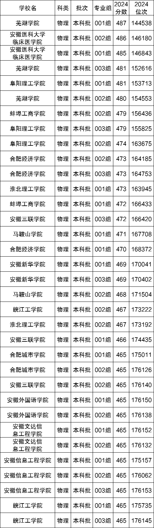 下面是2024年各安徽的民办本科大学在安徽省物理类的录取分数线