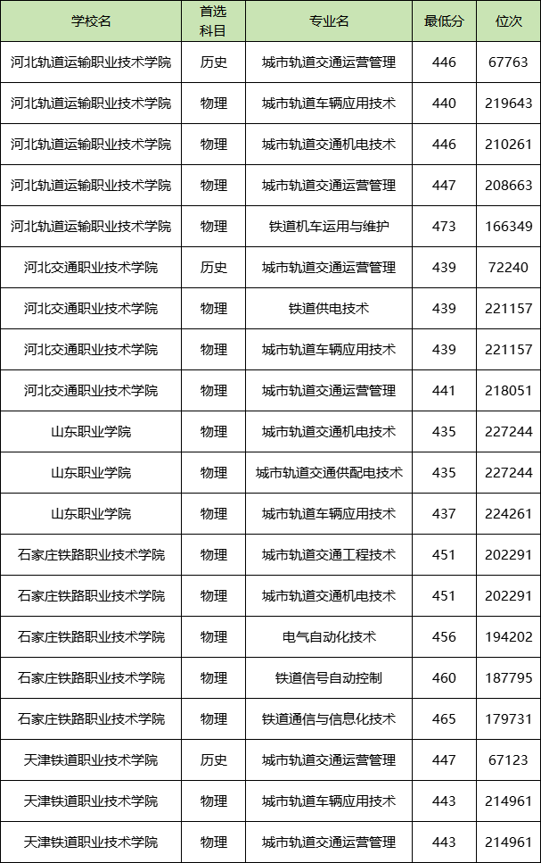 参考2024年河北省数据,铁路订单班录取线普遍较高,历史类录取分数最低为河北轨道运输职业技术学院439分,物理类录取分数最低为山东职业学院435分。