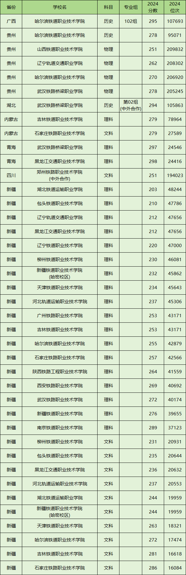 贵州:历史类最低278分(哈尔滨铁道职业技术学院);物理类最低251分(山西铁道职业技术学院);