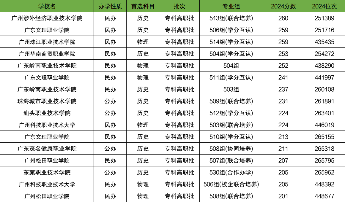 物理类:广州珠江职业技术学院259分、广东岭南职业技术学院252分、广东文理职业学院241分。
