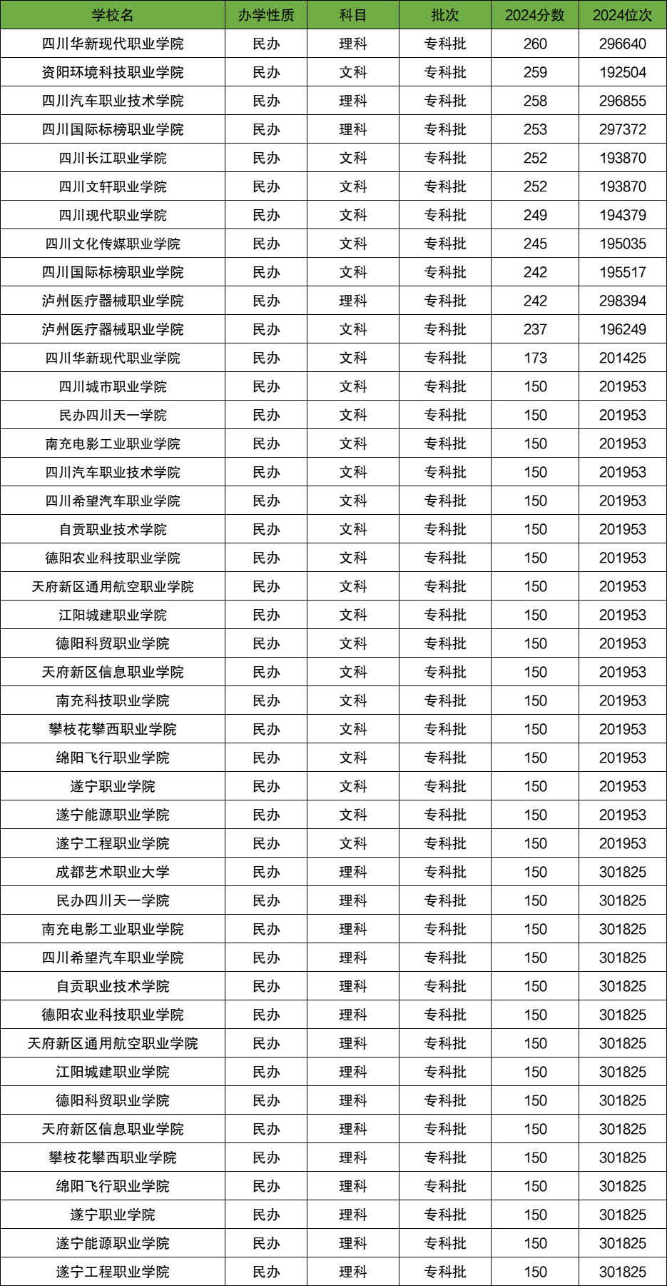 2024年四川专科批分数线为150分,260分考生选择空间大。