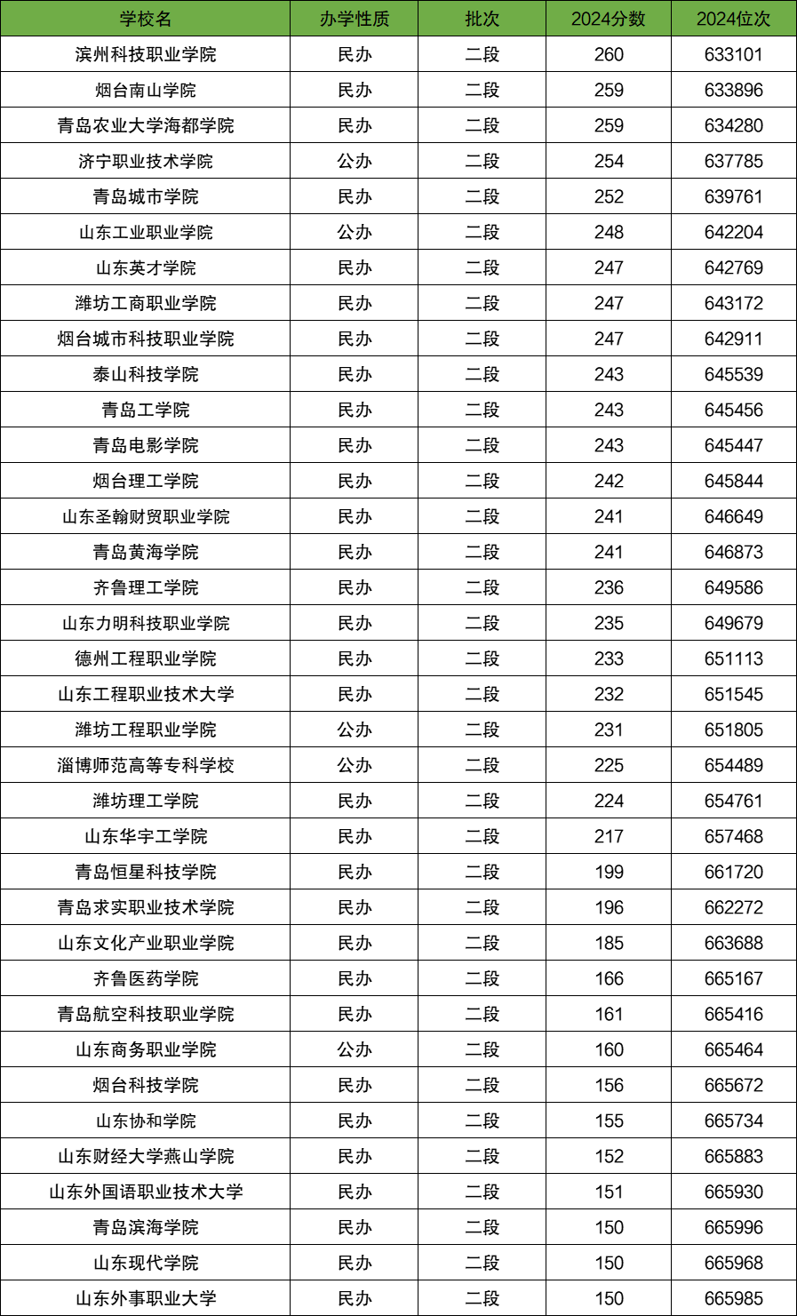 滨州科技职业学院260分、烟台南山学院259分、青岛农业大学海都学院259分、济宁职业技术学院254分。
