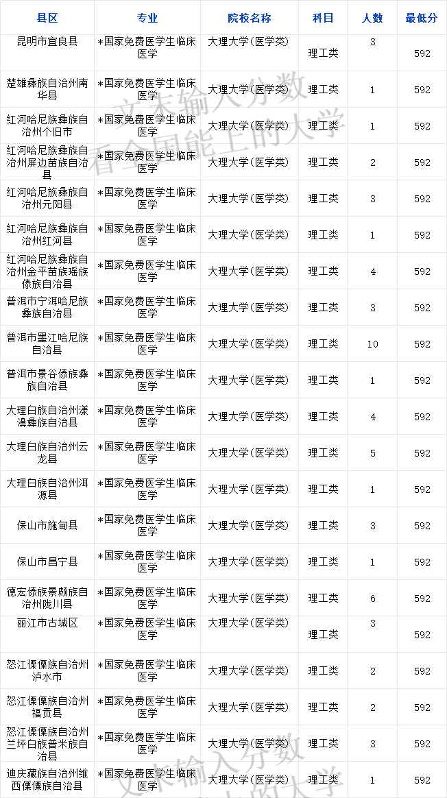 2024年在云南招收理科生的免费医学生院校有2所,共招生120人,所有免费医学生最低分数线为592分,所以在云南理科最低592分就能上免费医学生院校。