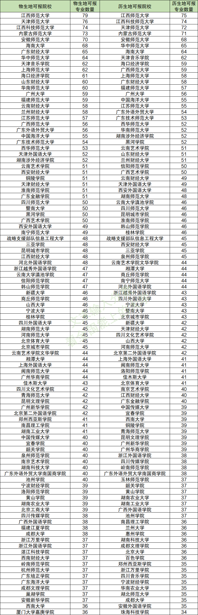 如天津师范大学物生地可报76个专业,历生地能报72个专业;内蒙古师范大学物生地可报73个专业,历生地可报71个专业;安徽师范大学物生地可报70个专业,历生地可报68个专业等。