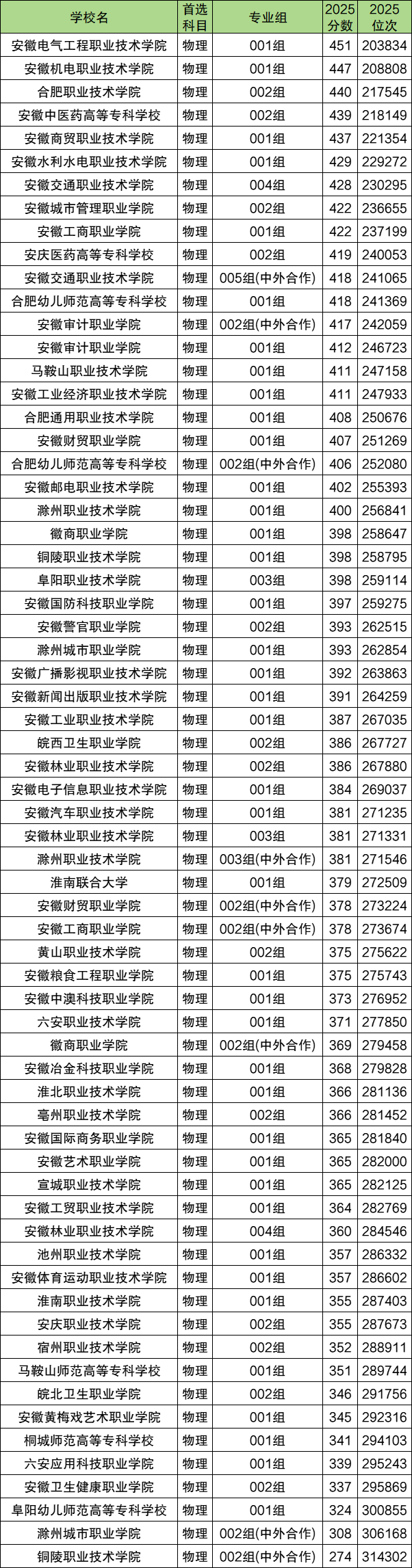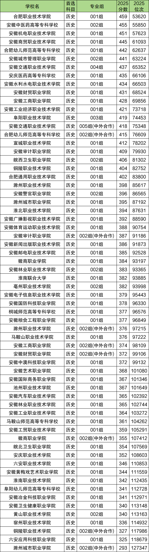 2025年安徽历史类收分最低的公办大专是滁州城市职业学院(002组、中外合作),最低分是293分,对应位次是127347名;收分最高的公办大专是合肥职业技术学院(001组),最低分是459分,对应位次是53620名;