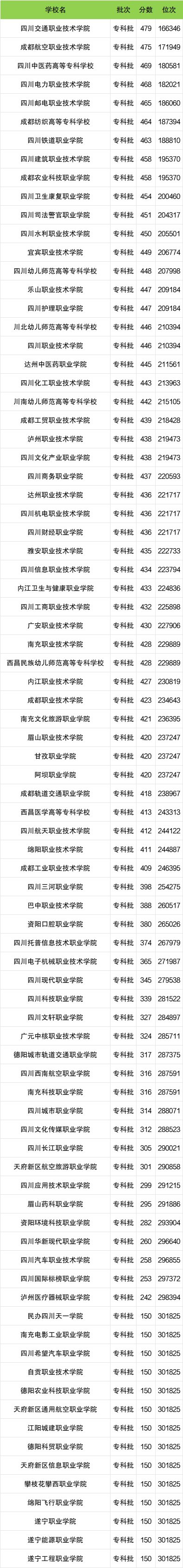 下面是2024年四川专科学校理科录取分数线一览表: