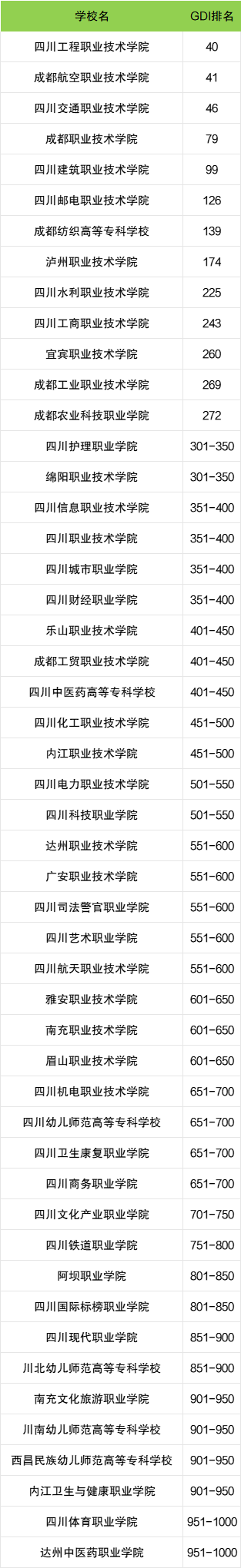 本文以2024年GDI全国高职高专院校排名为参考依据,列举四川内专科院校的全国排名情况,其中排名前5的分别为:
