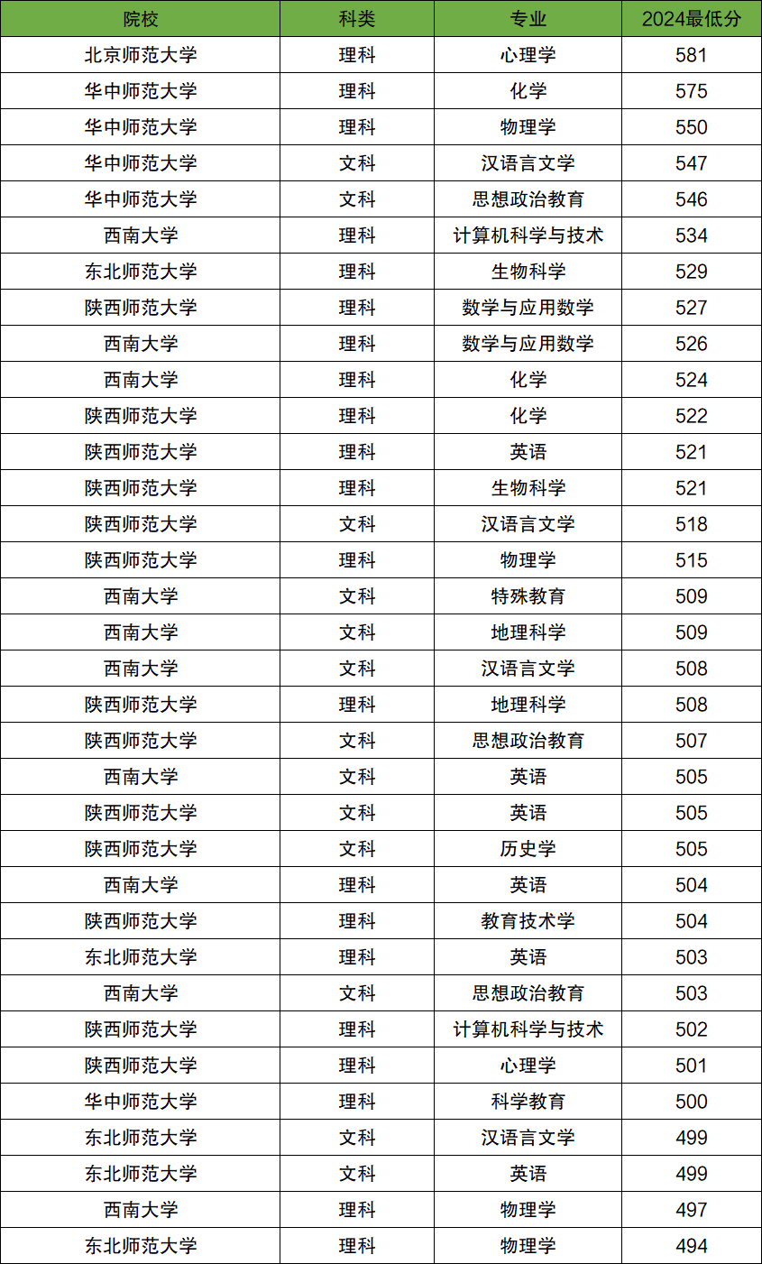 除此之外还有西南大学、北京师范大学、陕西师范大学等,下表为具体学校名单及分数线。