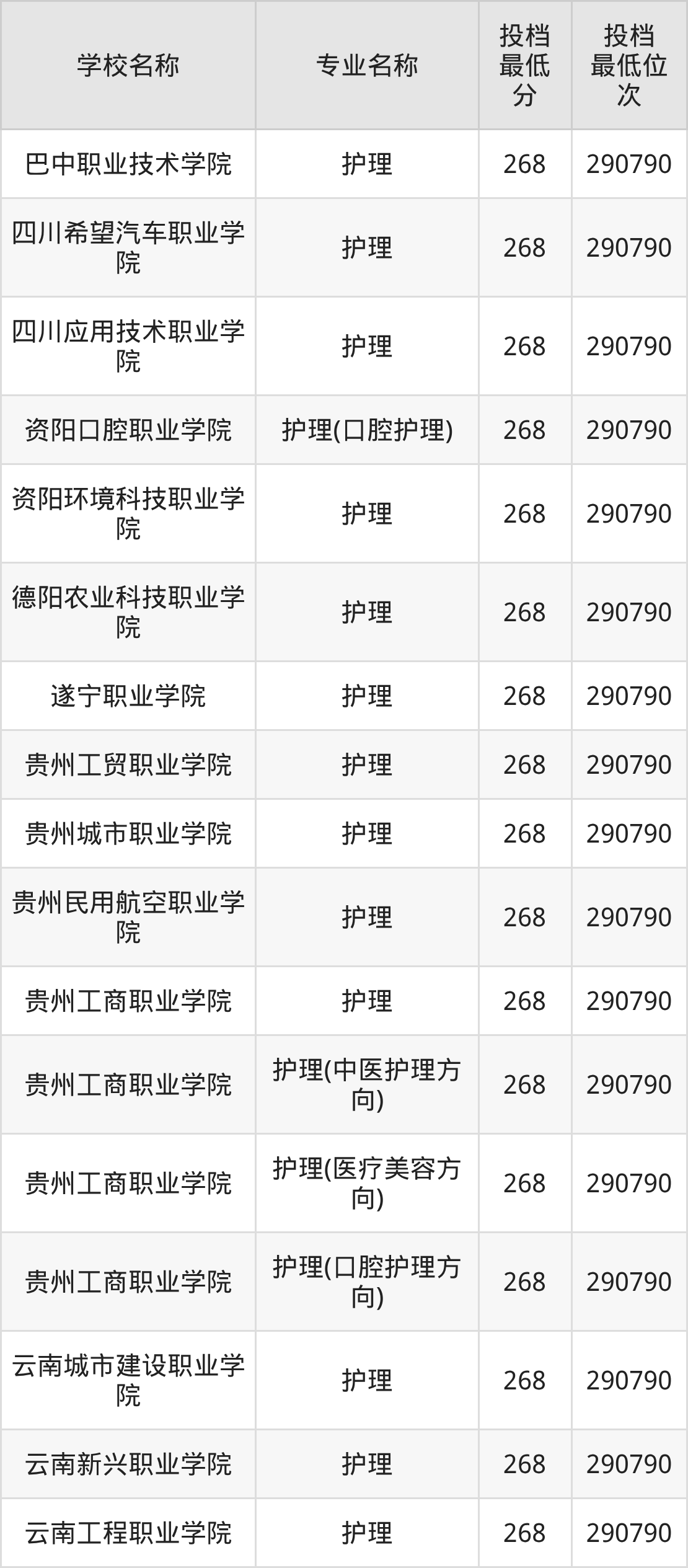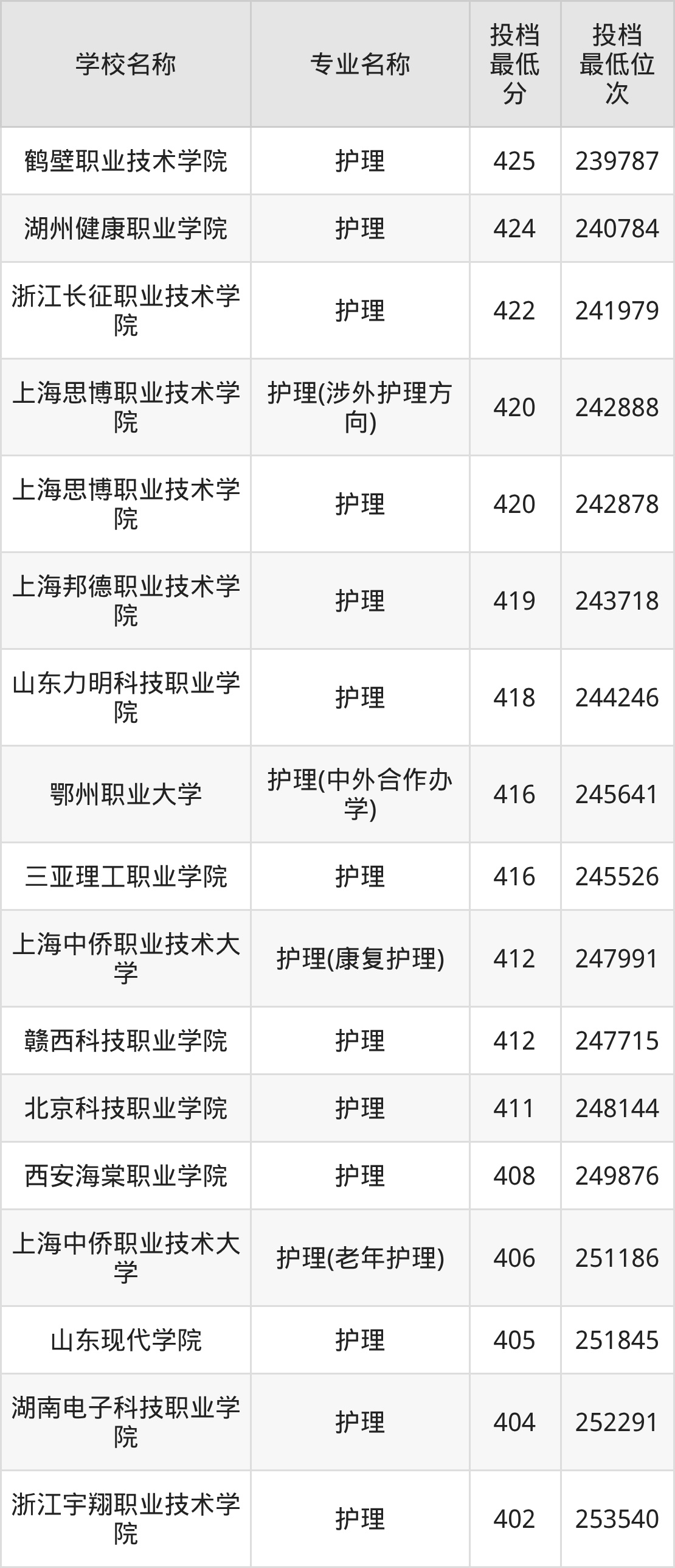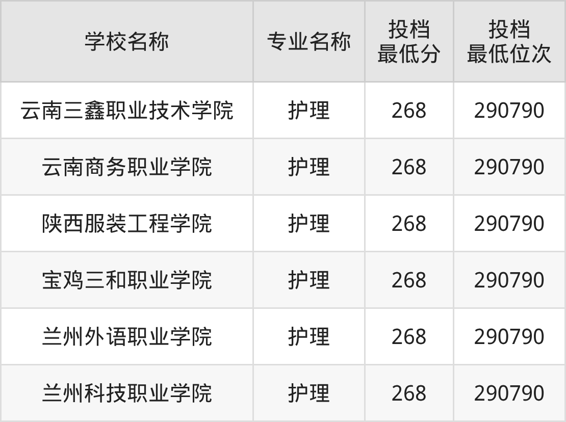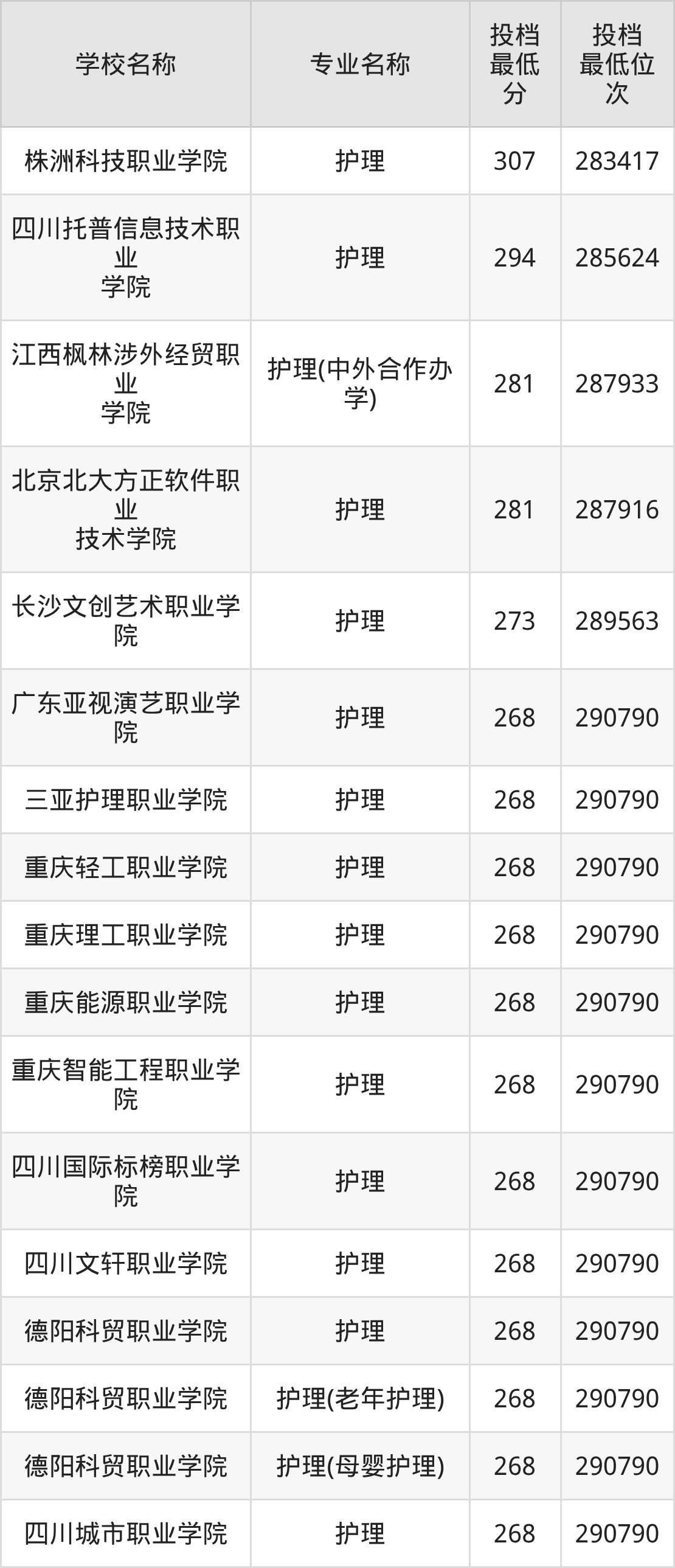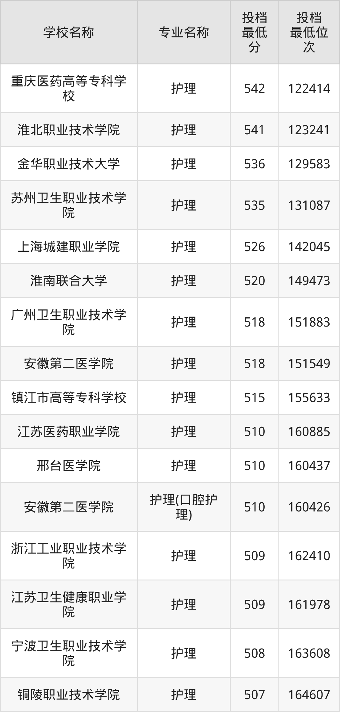 护理分数最低的专科学校是兰州科技职业学院,2025年最低分268分,刚好在本科线268分处。收分最高的是重庆医药高等专科学校,护理2025年最低分542分,对应全省排名是122414名,超本科线274分才能上。