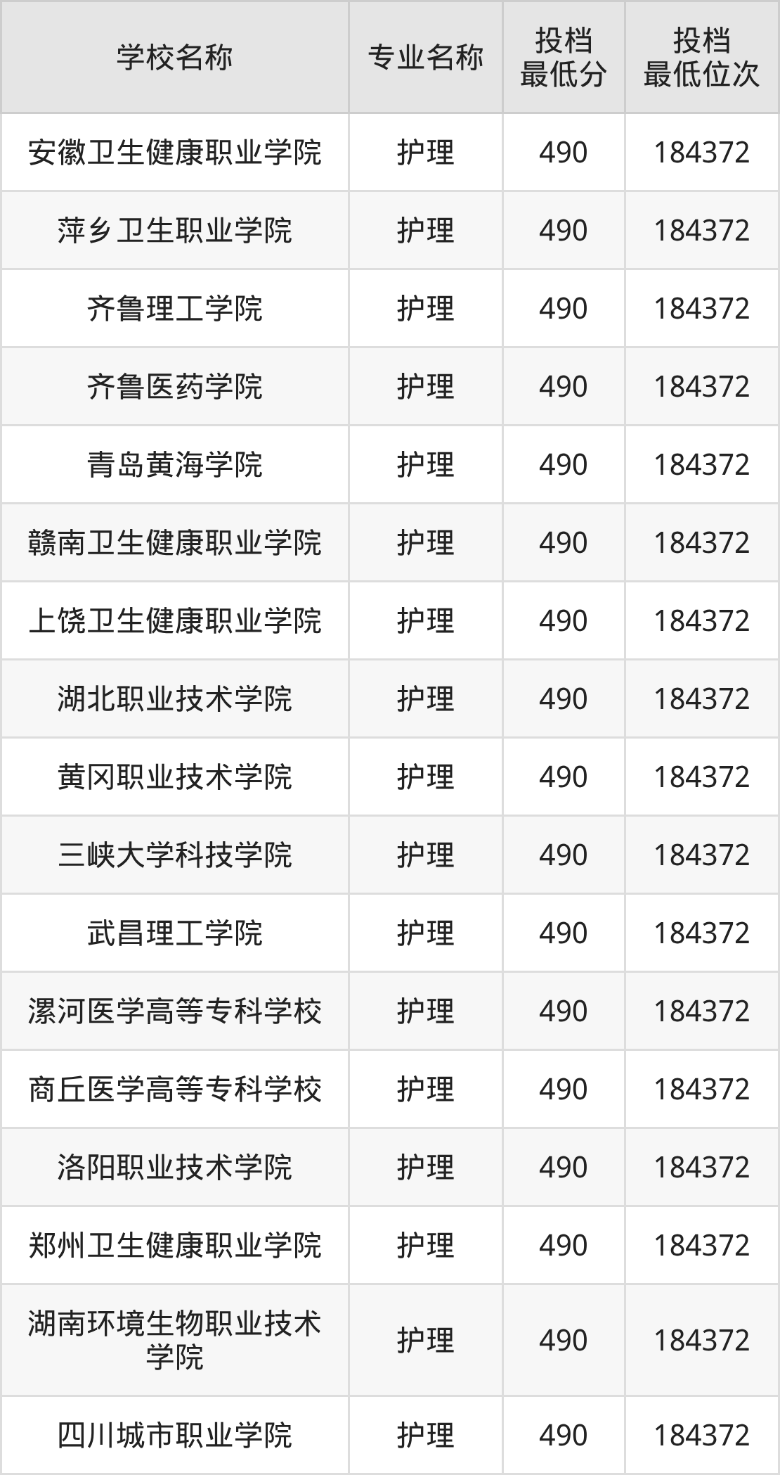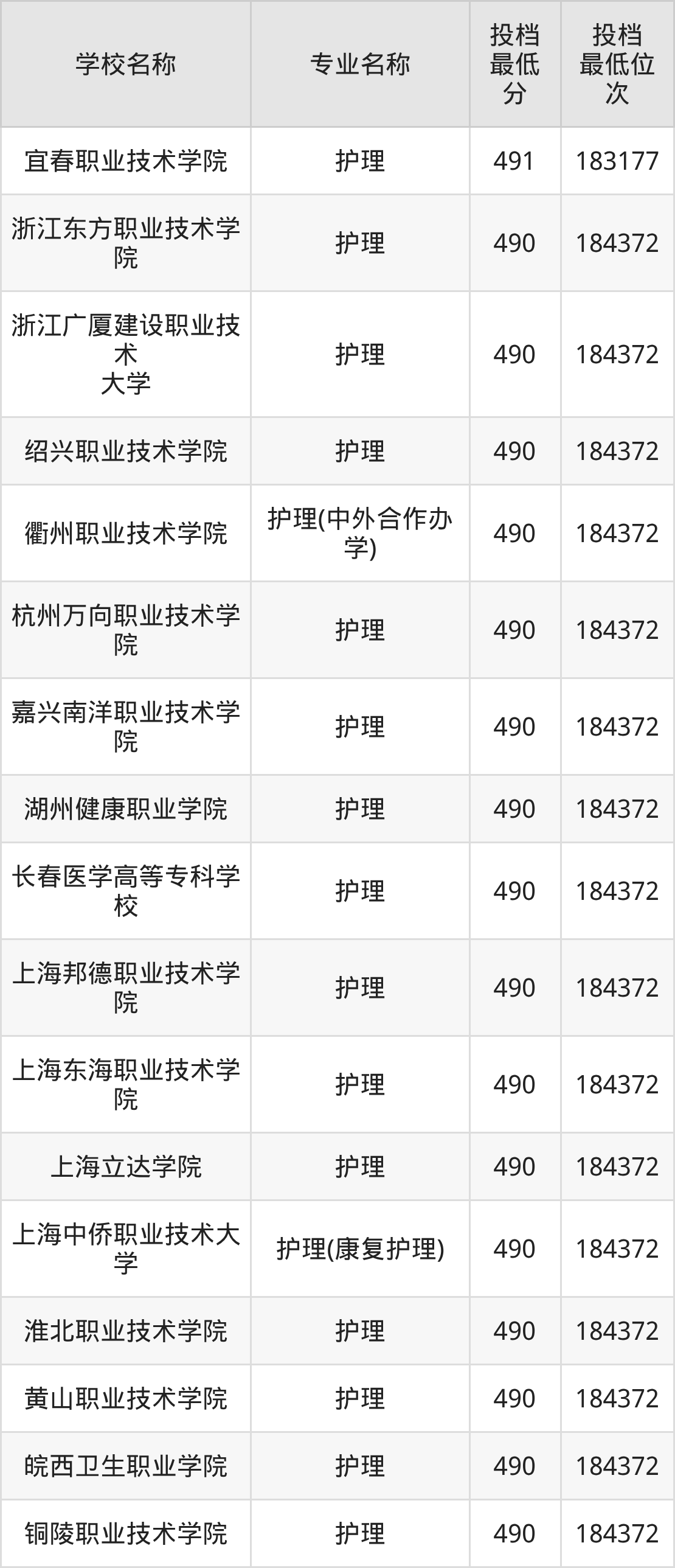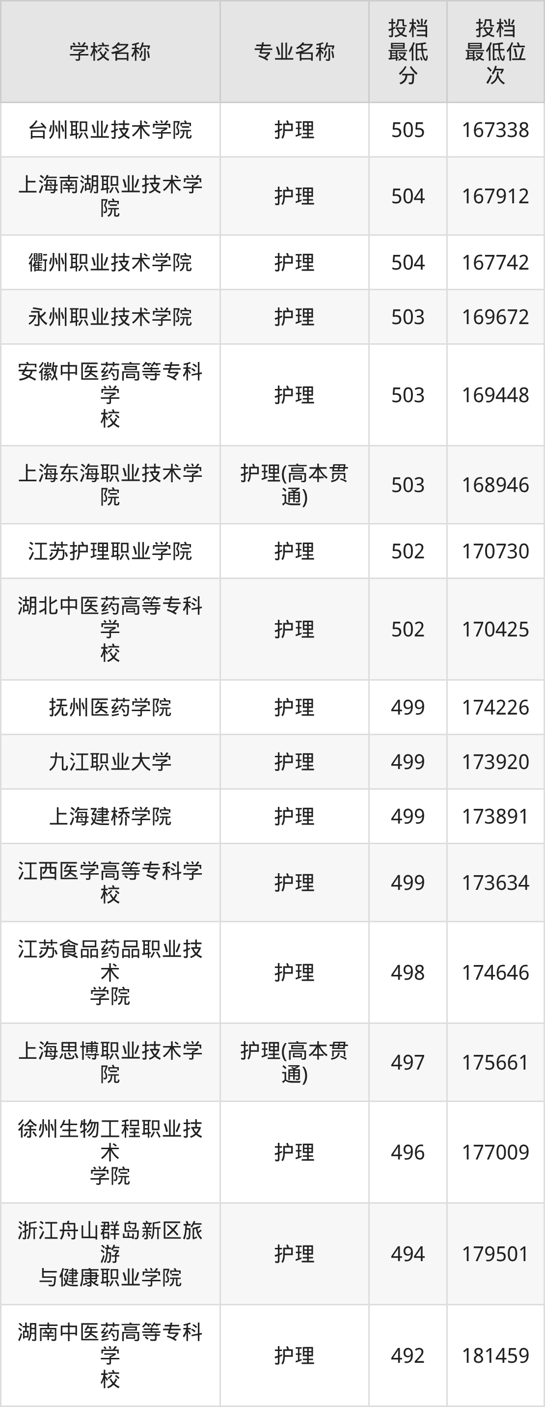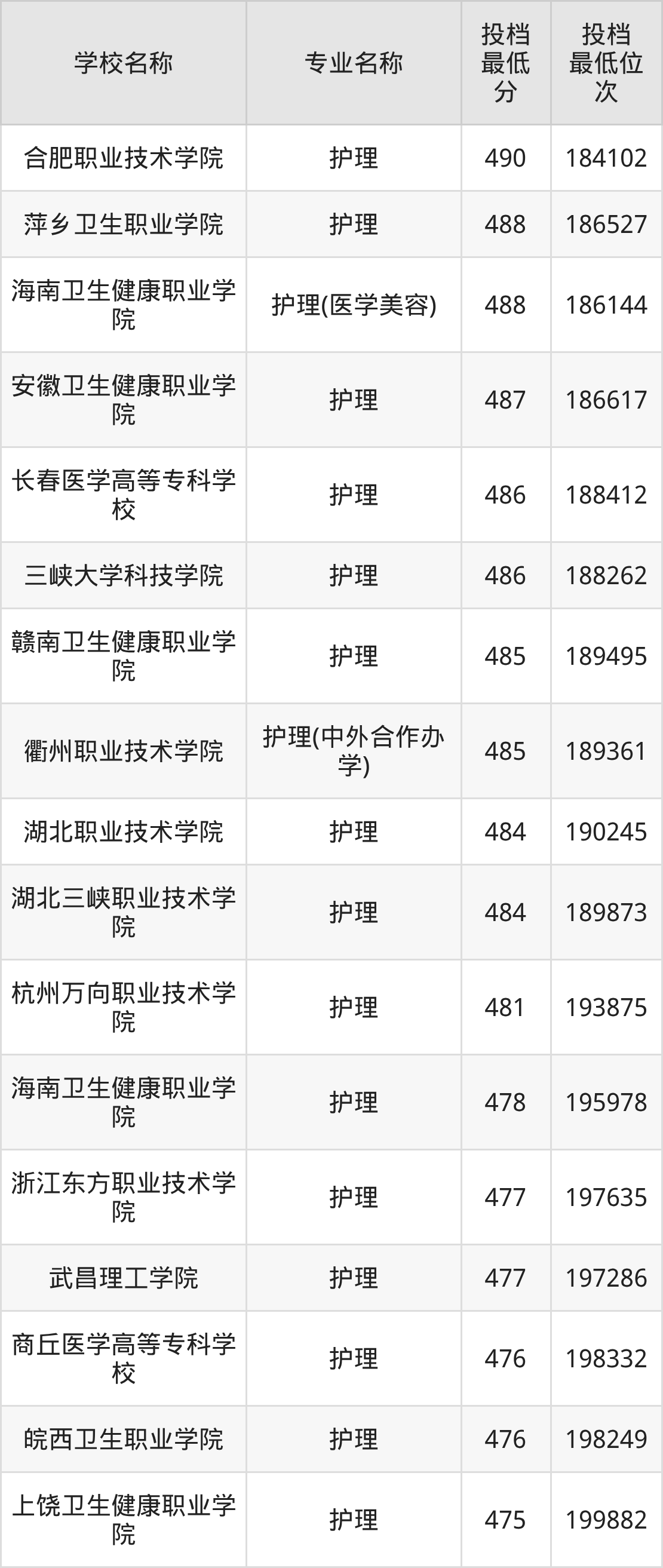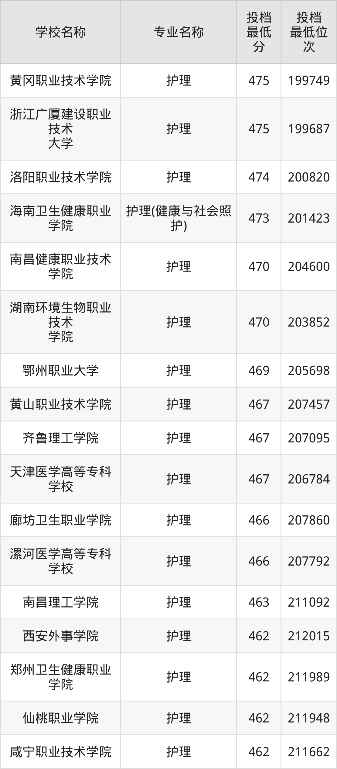 护理分数最低的专科学校是兰州科技职业学院,2025年最低分268分,刚好在本科线268分处。收分最高的是重庆医药高等专科学校,护理2025年最低分542分,对应全省排名是122414名,超本科线274分才能上。