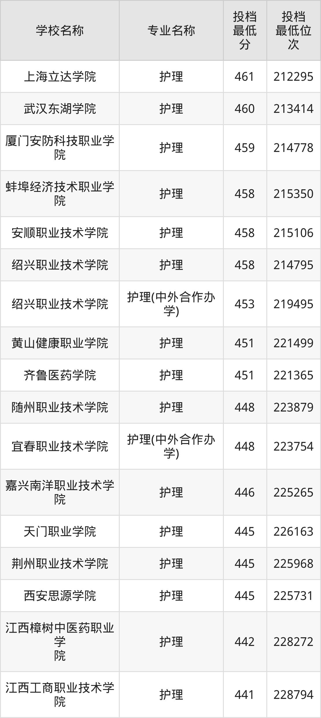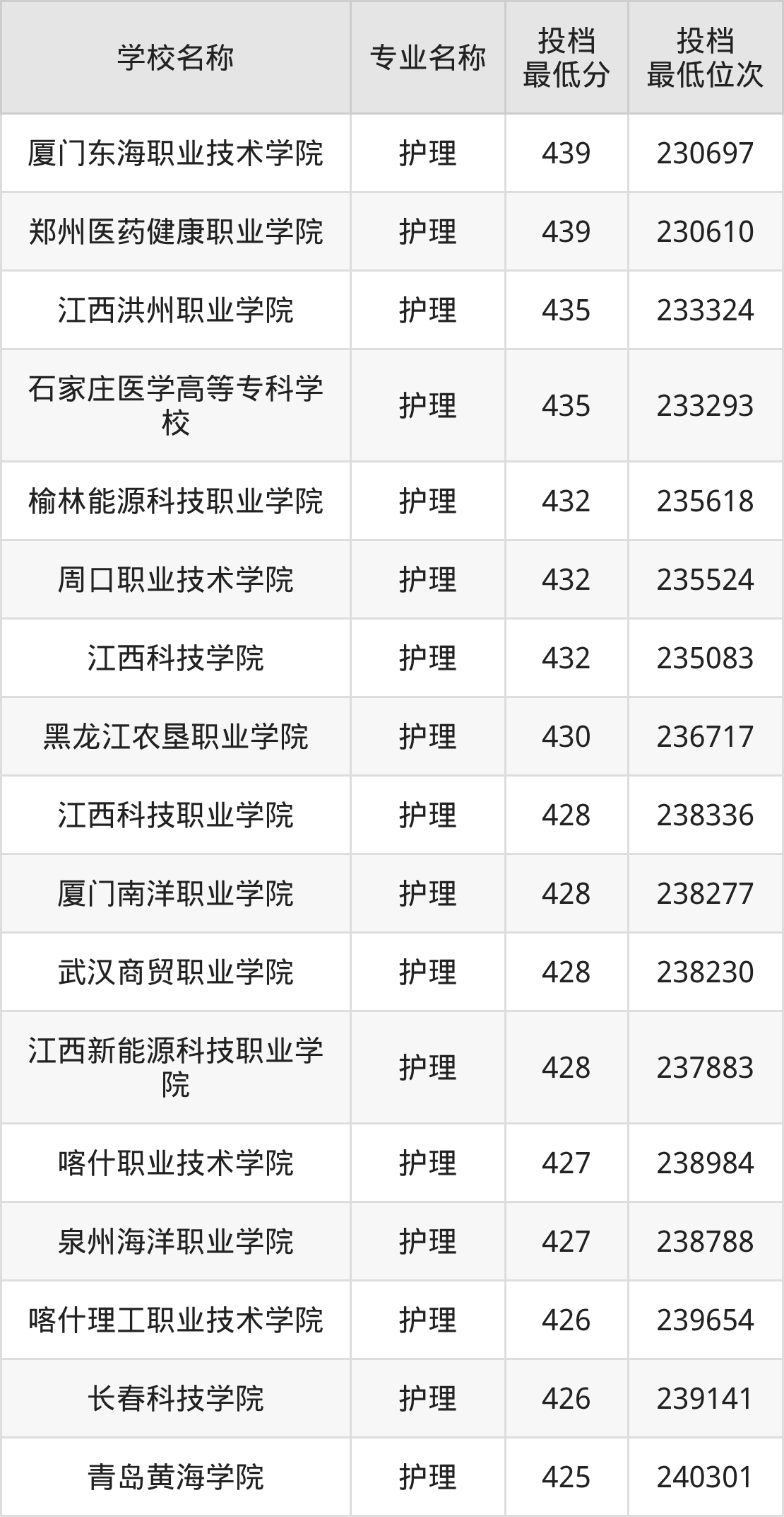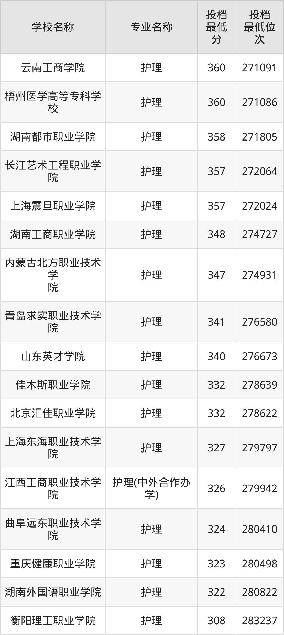 低于331分能上的护理专业大学全部为民办性质,录取分数线最低的公办大学是佳木斯职业学院,2025年最低分332分,即高考生至少需要超过专科线64分及以上才有机会被公办专科大学的护理专业录取。