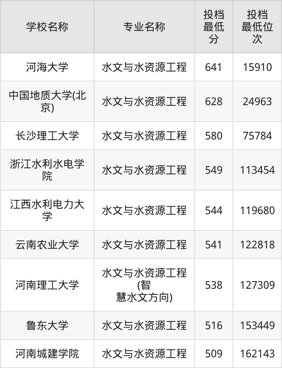 下面是2025年水文与水资源工程专业录取分数线一览表(9所大学汇总):