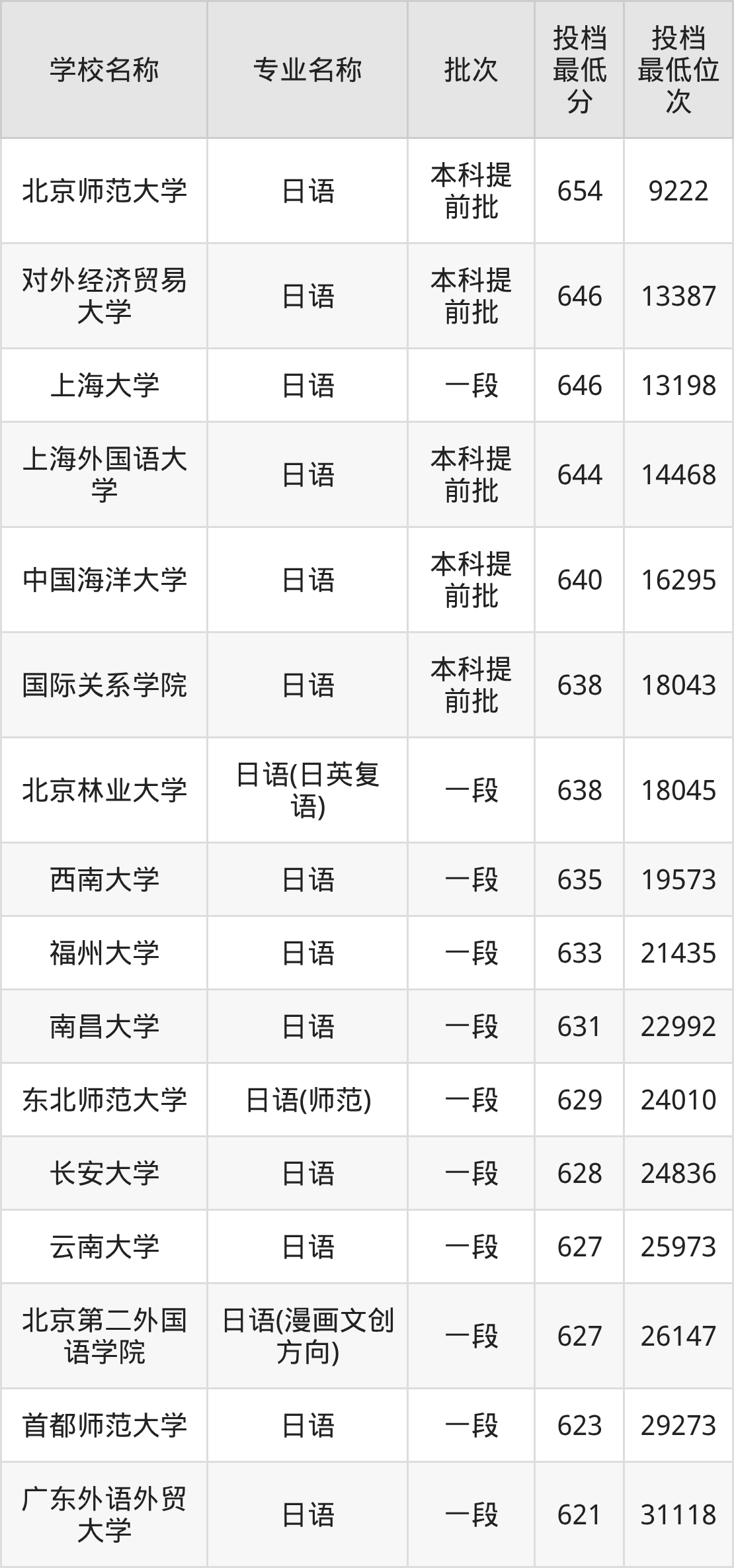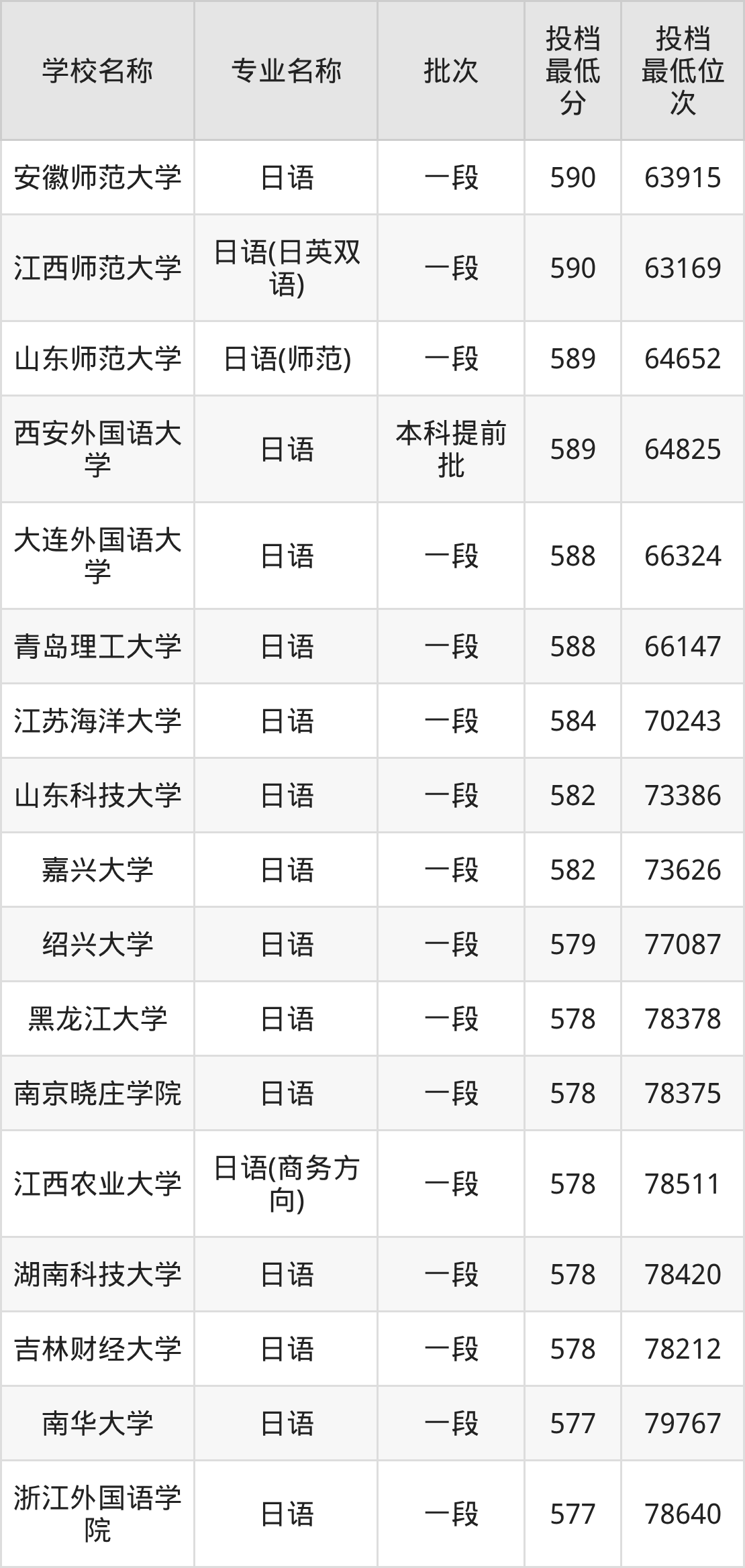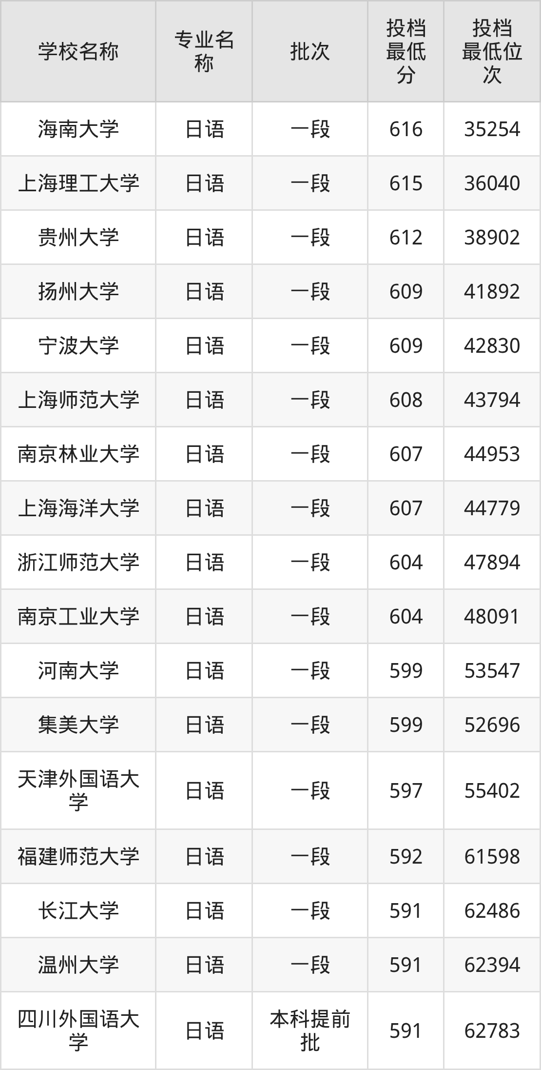 按照分数线从高到低排名,整理日语排名前十强名单如下: