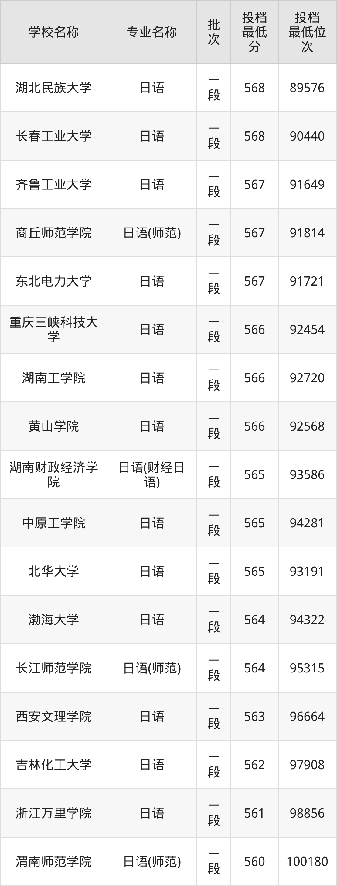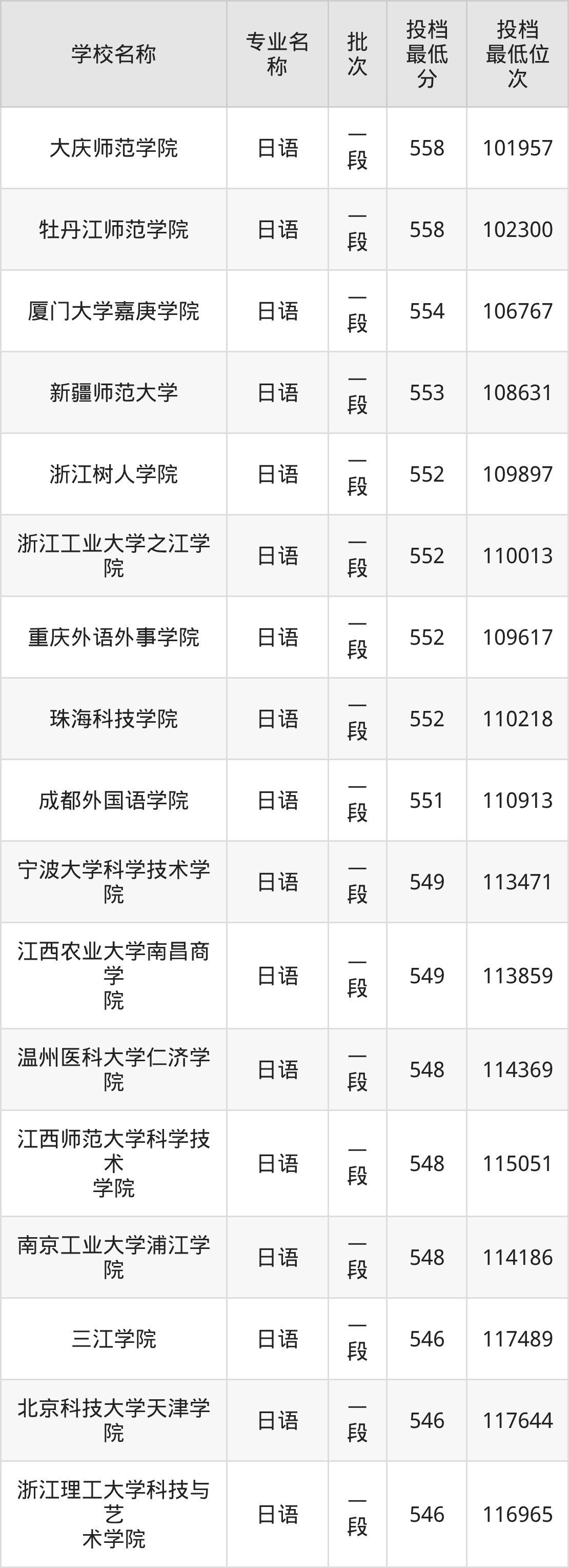 低于552分能上的日语专业大学全部为民办性质,录取分数线最低的公办大学是新疆师范大学,2025年最低分553分,即高考生至少需要超过一段线63分及以上才有机会被公办本科大学的日语专业录取。