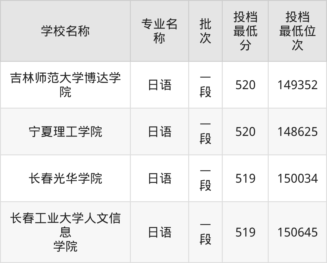 日语分数最低的本科学校是长春工业大学人文信息学院,2025年最低分519分,超一段线29分。收分最高的是北京师范大学,日语2025年最低分654分,对应全省排名是9222名,超一段线164分才能上。