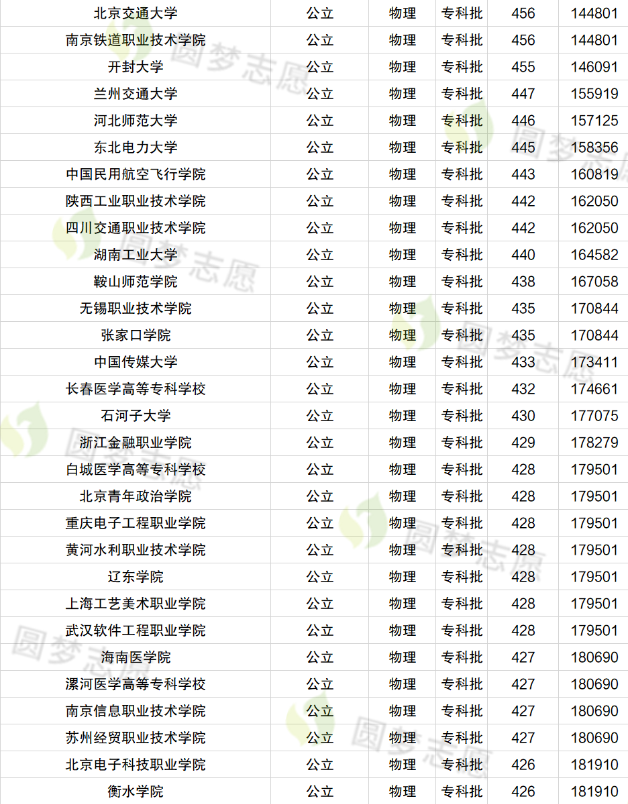 北京交通大学456分、南京铁道职业技术学院456分、开封大学455分、兰州交通大学447分、河北师范大学446分、东北电力大学445分、中国民用航空飞行学院443分、陕西工业职业技术学院442分、张家口学院435分等。
