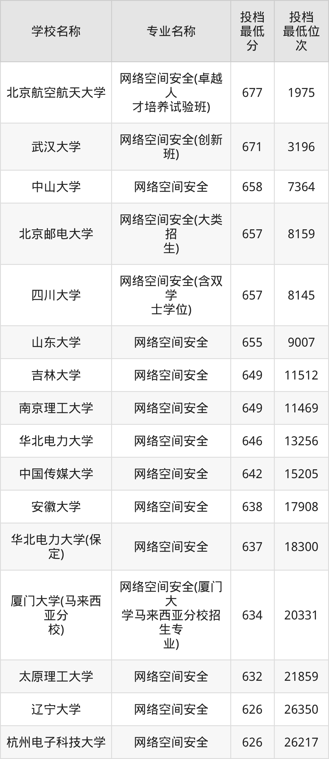 按照分数线从高到低排名,整理网络空间安全排名前十强名单如下: