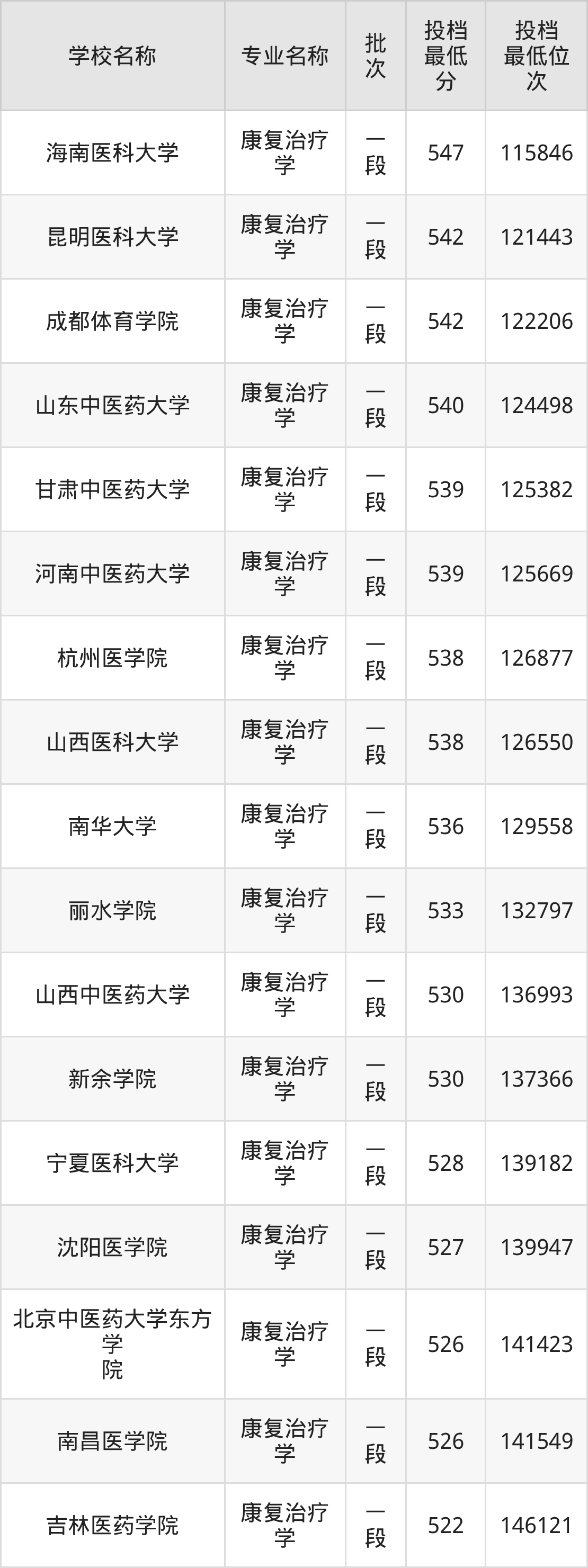 下面是2025年康复治疗学专业录取分数线一览表(61所大学汇总):