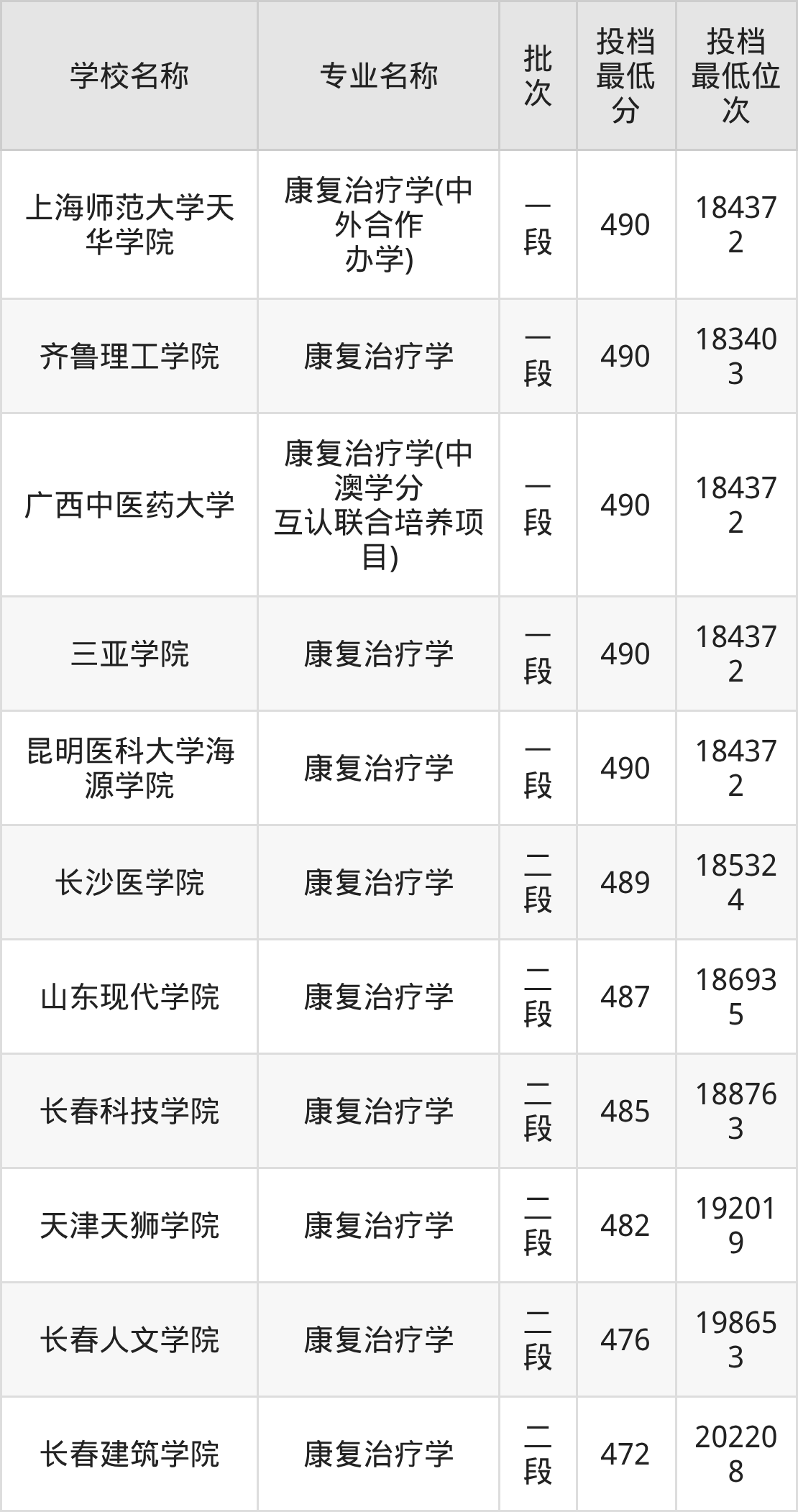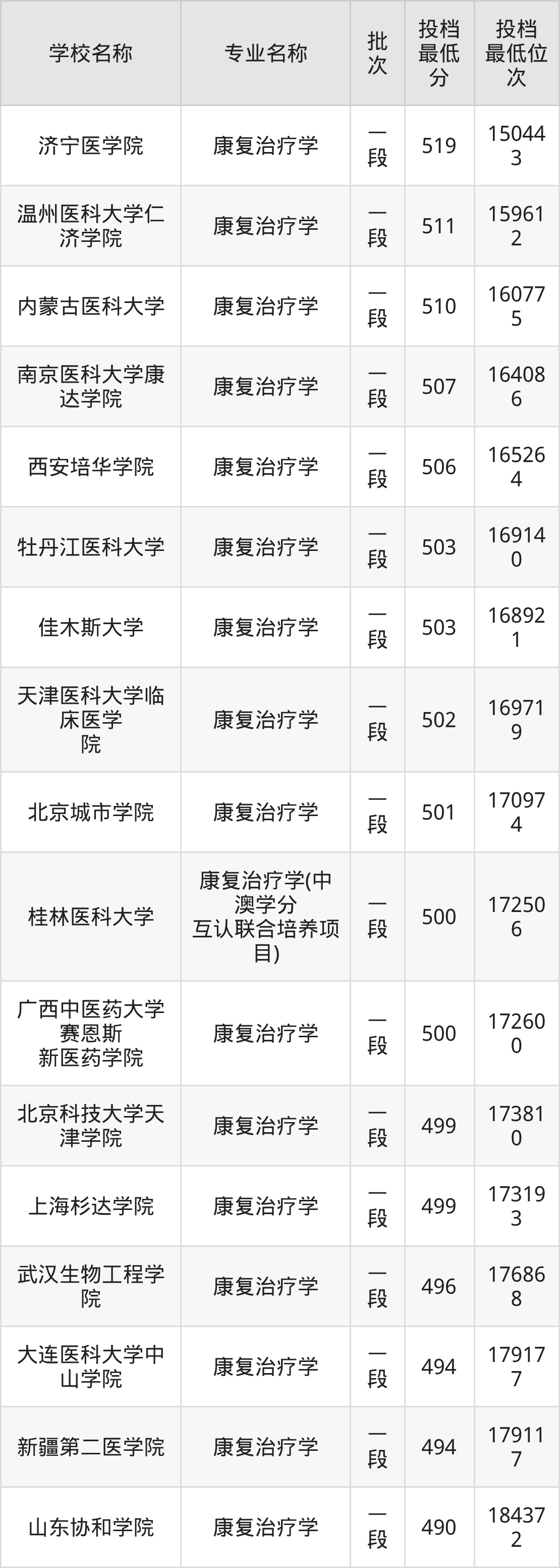 低于489分能上的康复治疗学专业大学全部为民办性质,录取分数线最低的公办大学是广西中医药大学,2025年最低分490分,即高考生至少需要超过一段线0分及以上才有机会被公办本科大学的康复治疗学专业录取。