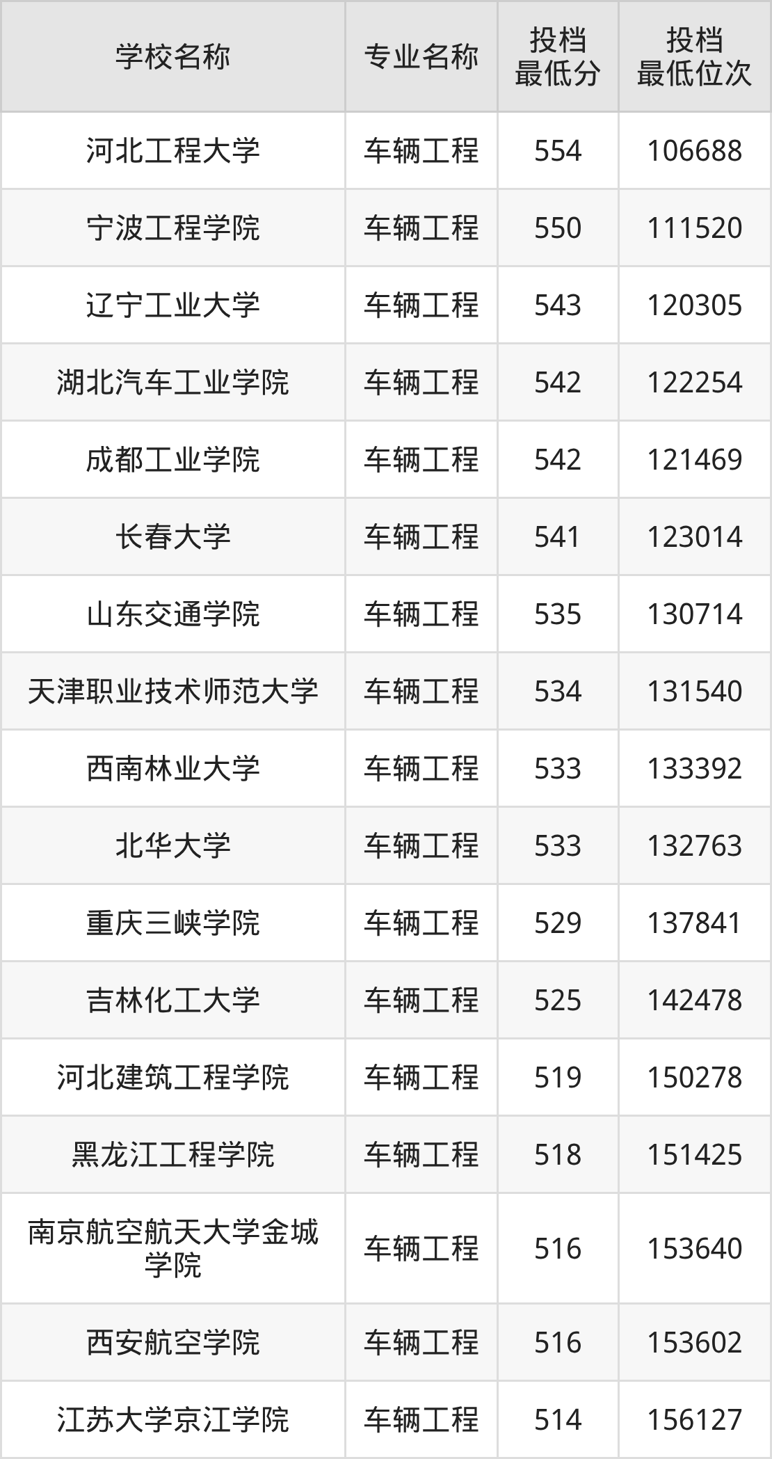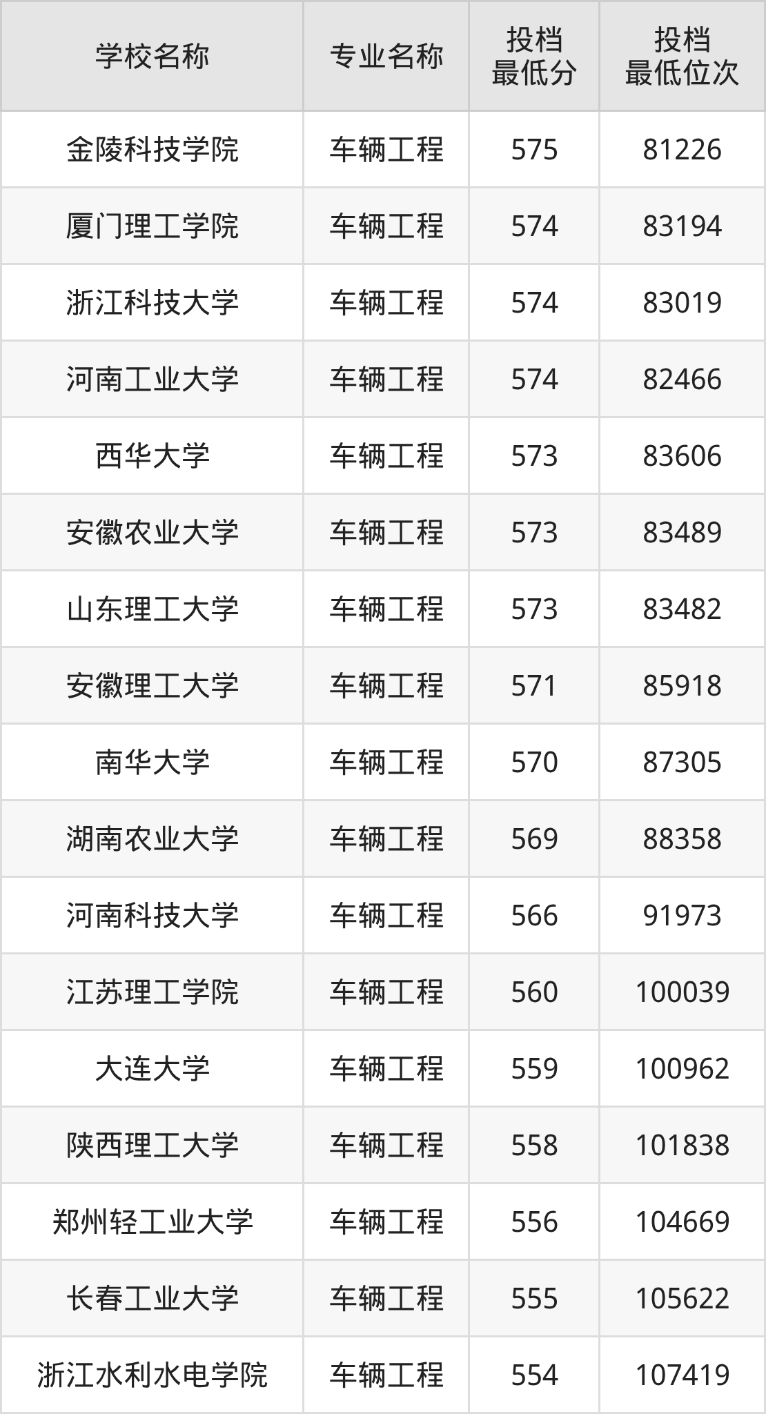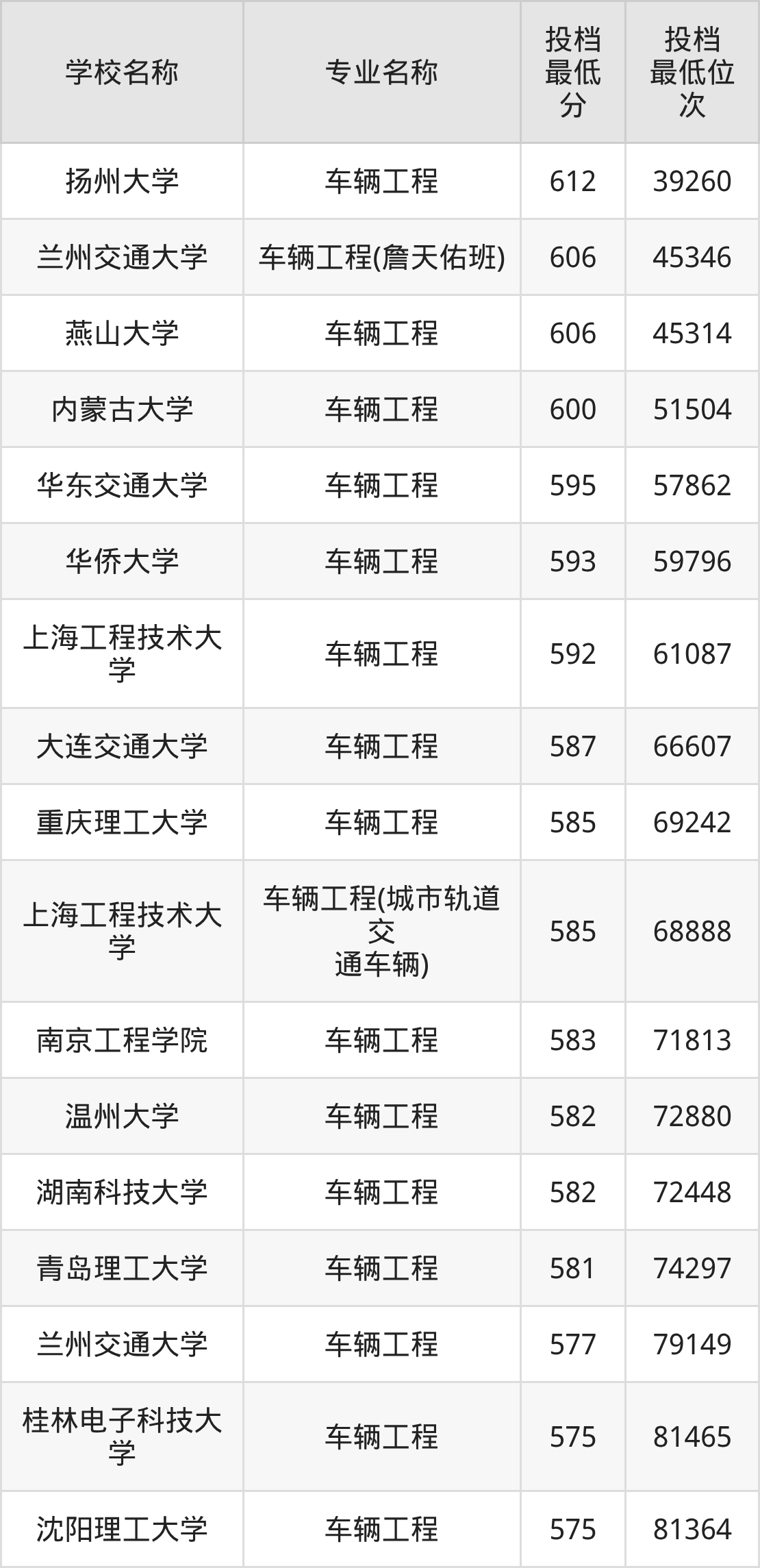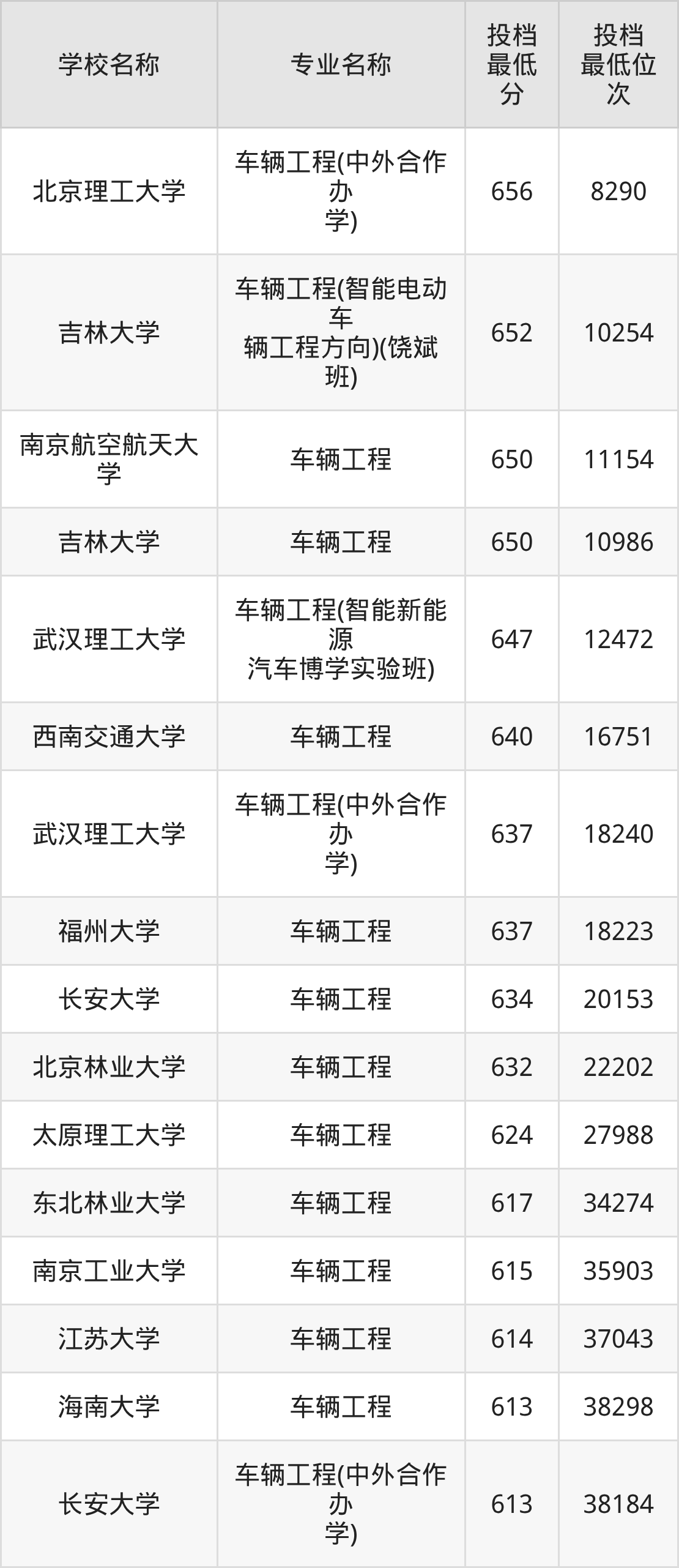 下面是2025年车辆工程专业录取分数线一览表(84所大学汇总):